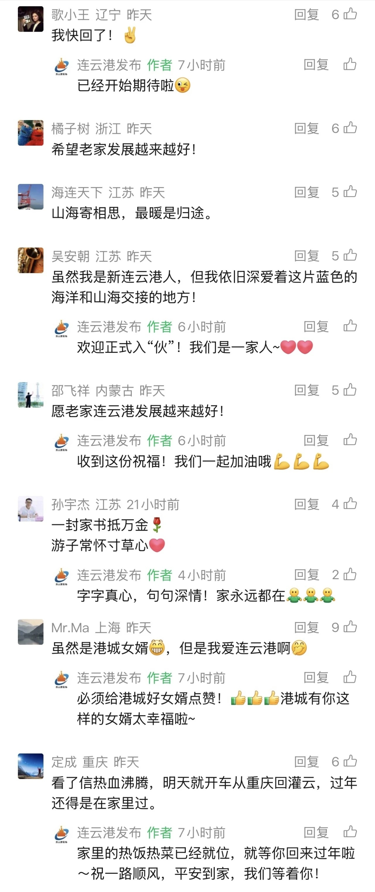 家书寄情,字字皆暖,异乡游子的乡愁被悉心珍藏。“每次过年的返乡,就是对家乡深深的依恋”“离家愈久愈念海州湾的风、花果山的云,更念街巷里的豆丹香与亲人的笑颜”……家书推送后,天南海北的连云港人纷纷在留言区倾诉乡情,字里行间满是对家乡风物、亲人陪伴、浓浓年味的眷恋。这份跨越山海的思念,不仅让网友们共情共鸣,更被家乡悉数珍藏。连云港市委、市政府在回应中坦言,游子们的每一份心声都直抵人心,这份藏于文字的思念与热爱,一次次让人感动破防。一纸家书,成为连接家乡与游子的情感纽带,将山海相隔的牵挂,化作最温暖的归乡期许。
