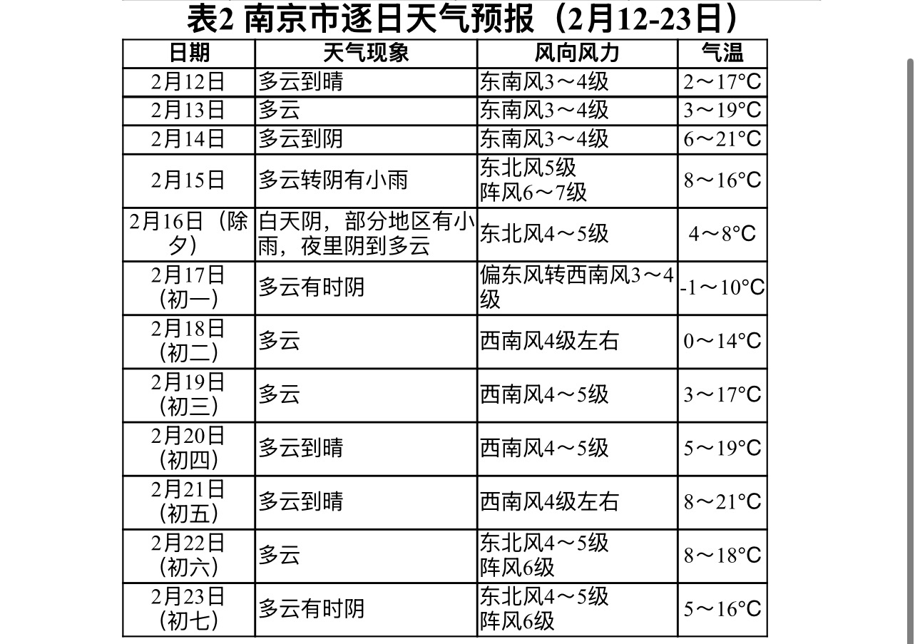 南京市气象台也同步发布了天气预报:12日至14日全市多云,最高气温可达17~21℃。15日至16日白天,全市大部分地区阴有小雨。15日受冷空气影响,风力增大,东北风5~7级;48小时最低气温将下降7~9℃,17日早晨全市最低气温-1℃左右。18日至21日全市以多云天气为主,气温回升。22日前后将有新一轮冷空气影响。