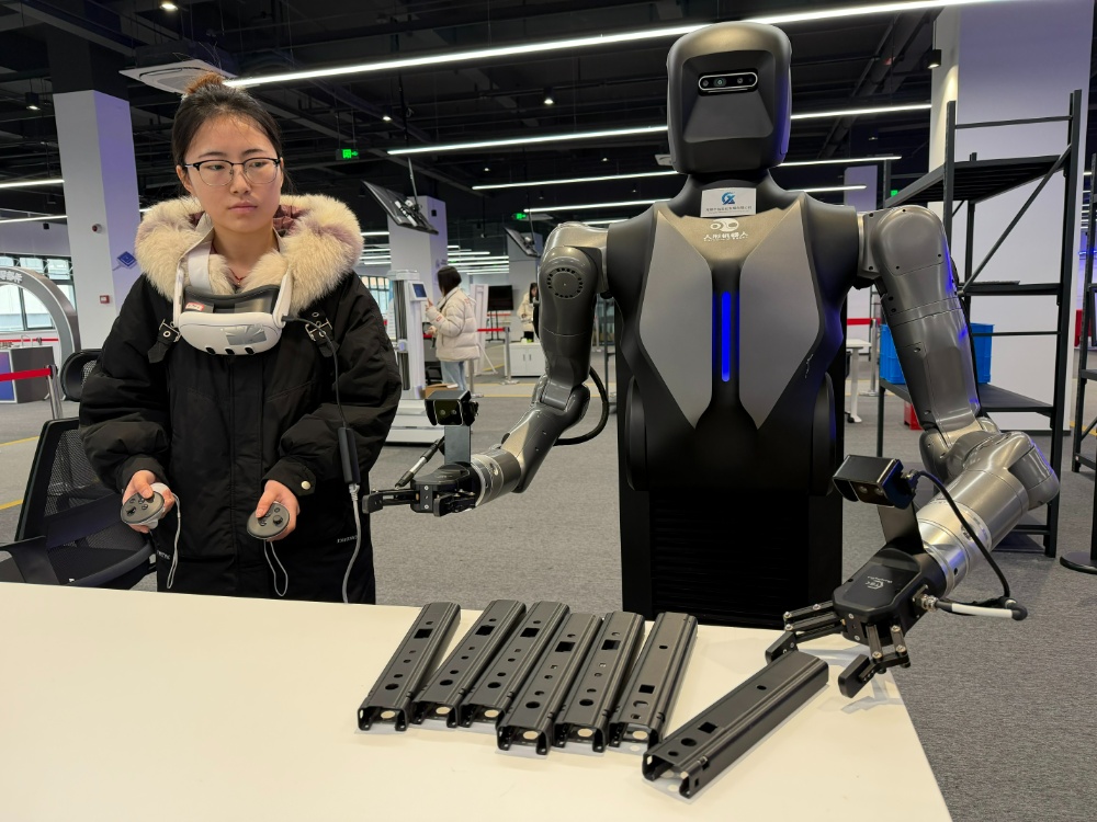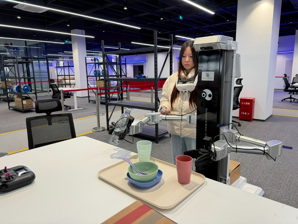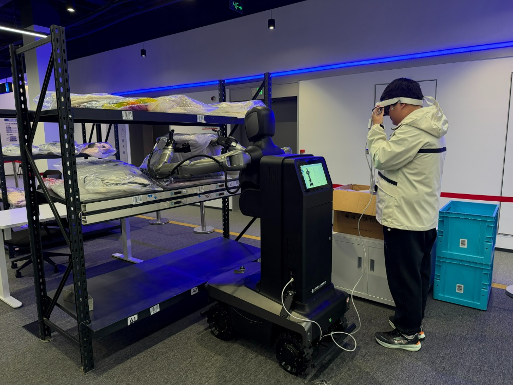 这时,何周宇迅速摘下VR眼镜,挂在颈间,双手各持一支操纵杆,左手按键,抬手伸向货架。机器人同步复刻,机械爪稳稳夹起货架上的羽绒服,平移,轻放入箱。
