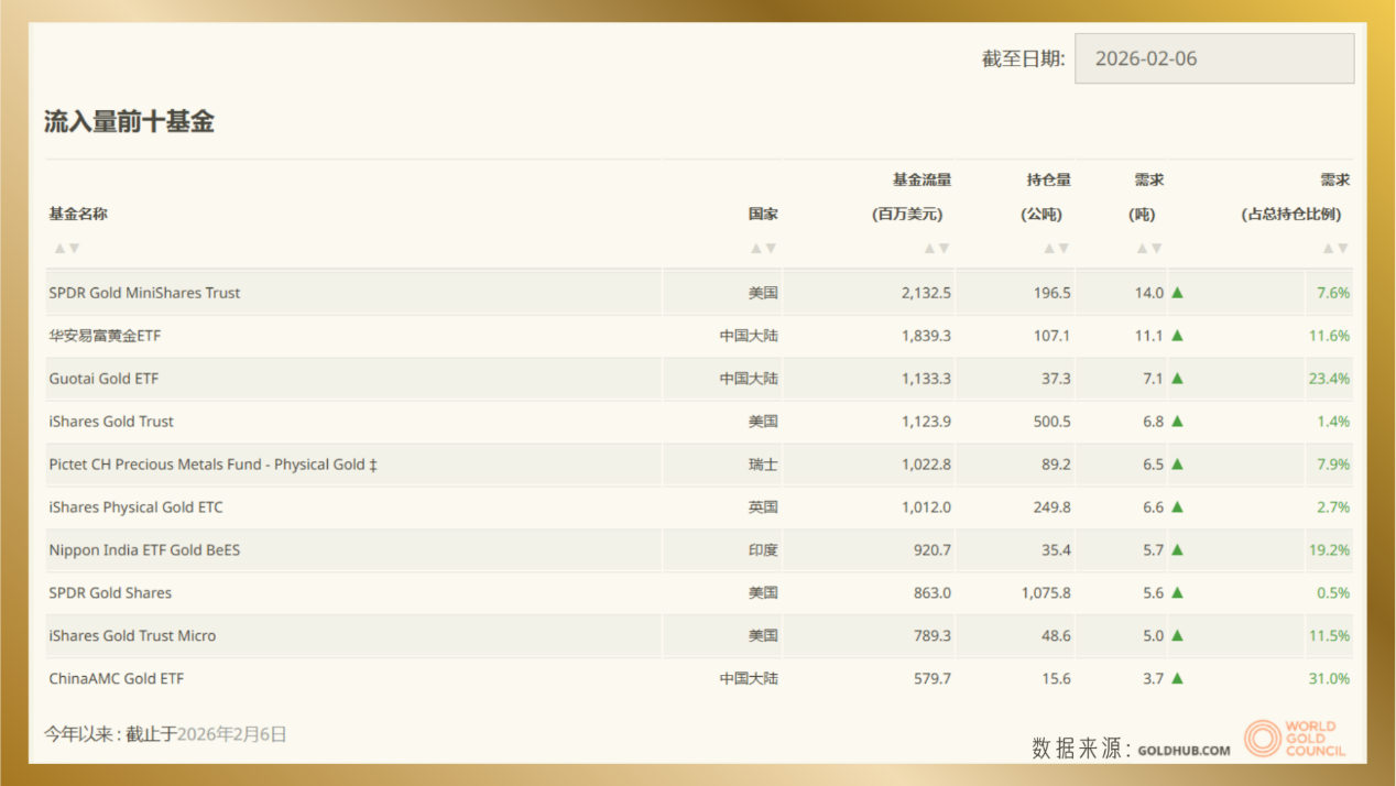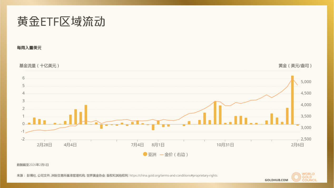 资金端的反应更为敏锐。伴随金价破顶,亚洲地区黄金ETF呈现“脉冲式升温”。2025年12月至2026年1月上旬,亚洲每周资金流入规模显著放量,全年流入合计约250亿美元。中国市场更是跑出“加速度”:2026年1月14日,华安黄金ETF管理规模突破1007.62亿元,成为国内首只千亿级商品ETF,全球规模排名第三,仅次于SPDR Gold Shares与iShares Gold Trust。