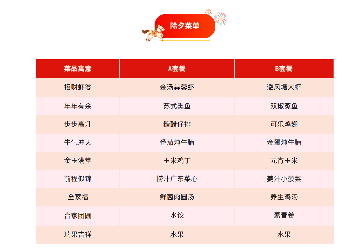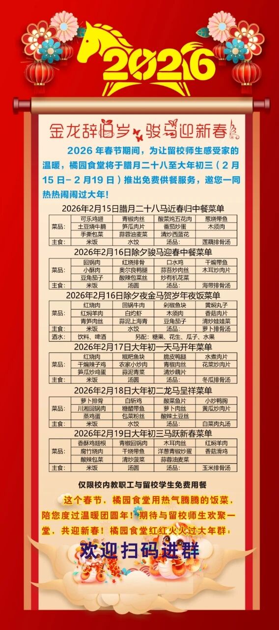 为了陪伴正在为学业坚守、为梦想奋进的师生们温暖过年,南京大学后勤不仅精心准备了“马年新春免费套餐”, 还为师生与家人朋友的团圆时刻备好了多样化的丰盛选择。