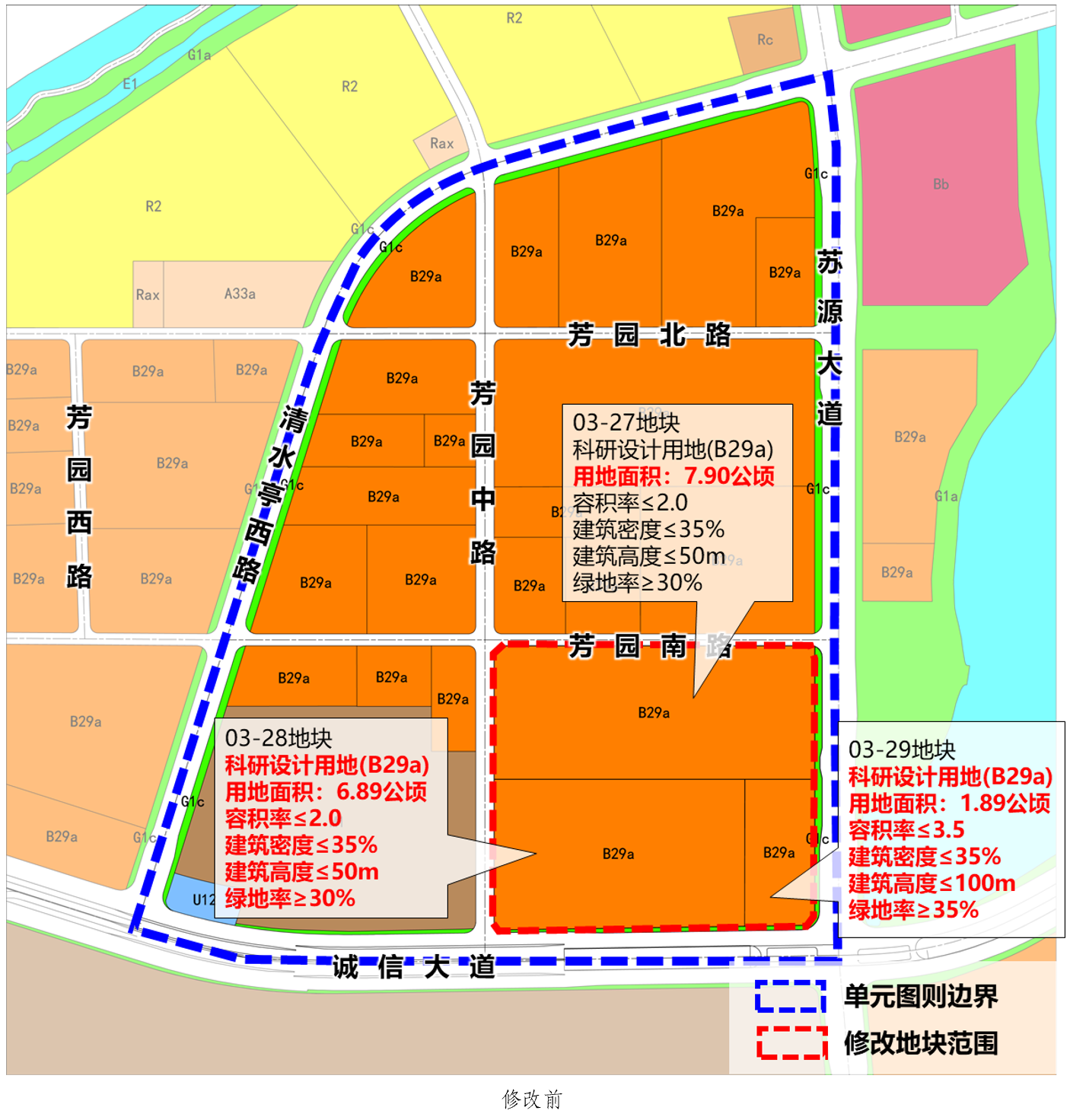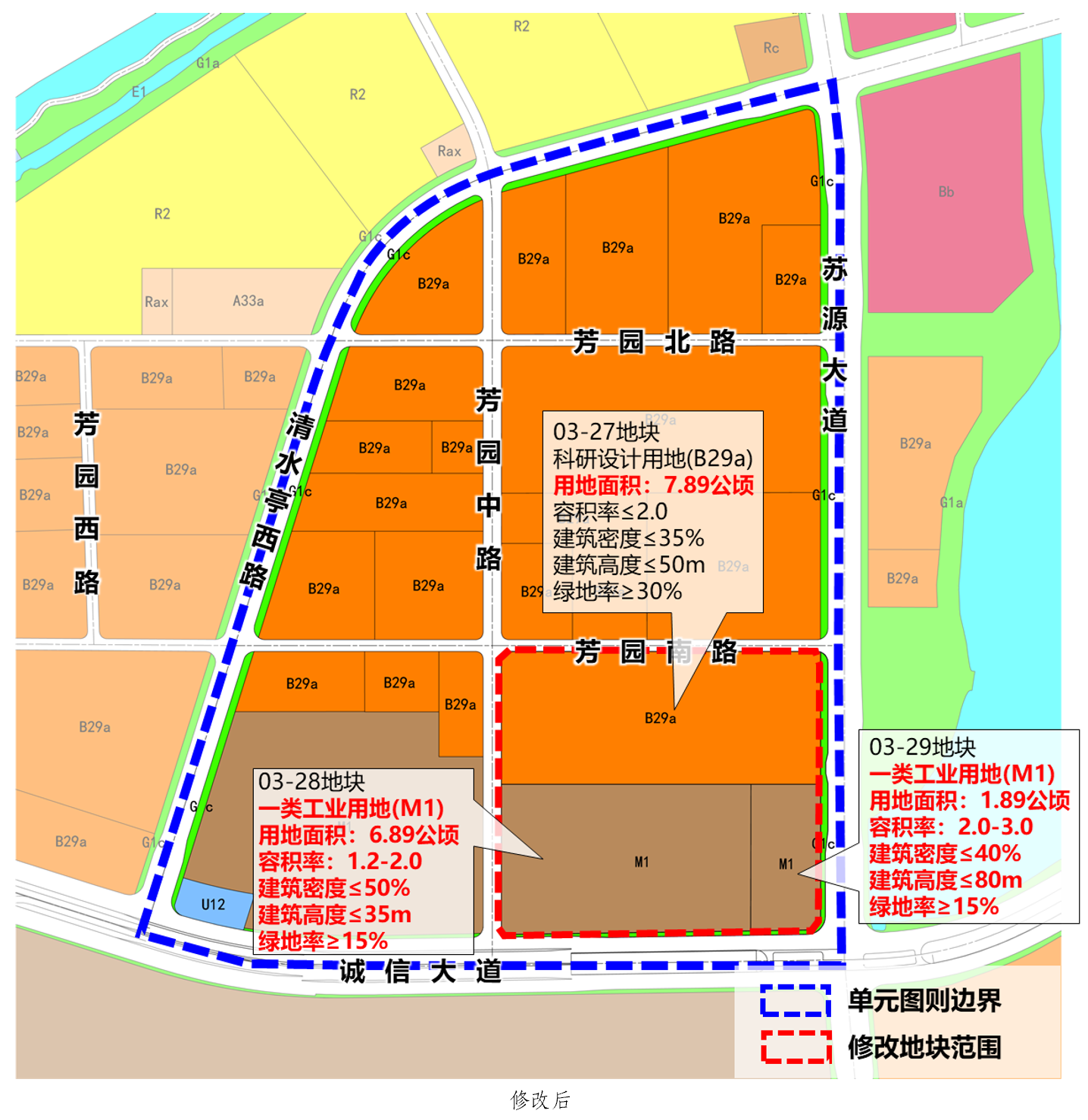 1.将原03-04、03-05、03-06地块科研设计用地(B29a)调整为03-04、03-05地块二类居住用地(R2),03-06地块街旁绿地(G1c)和03-33地块居住社区中心(Aa);