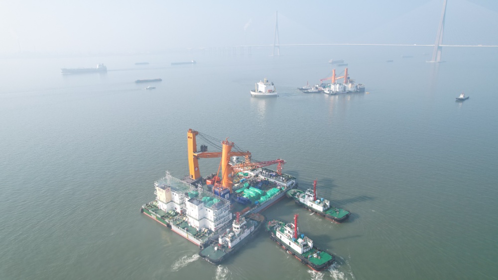 当天,南通港口轮驳有限公司4艘拖轮分别拖带4艘起重船从扬州海润船厂启程,跨越185公里(100海里)长江水域,耗时15小时将“大家伙”们安全护送至常熟亨通码头。2月12日,腊月廿五,江面能见度一度下降,23点30分,轮驳公司4艘拖轮历时6个小时终于将4艘起重船稳稳锚定常熟锚地。2月13日,腊月廿六,凌晨4点,另2艘拖轮又经历3小时“夜航接力”,全部抵达指定位置,为最终作业做好万全准备。