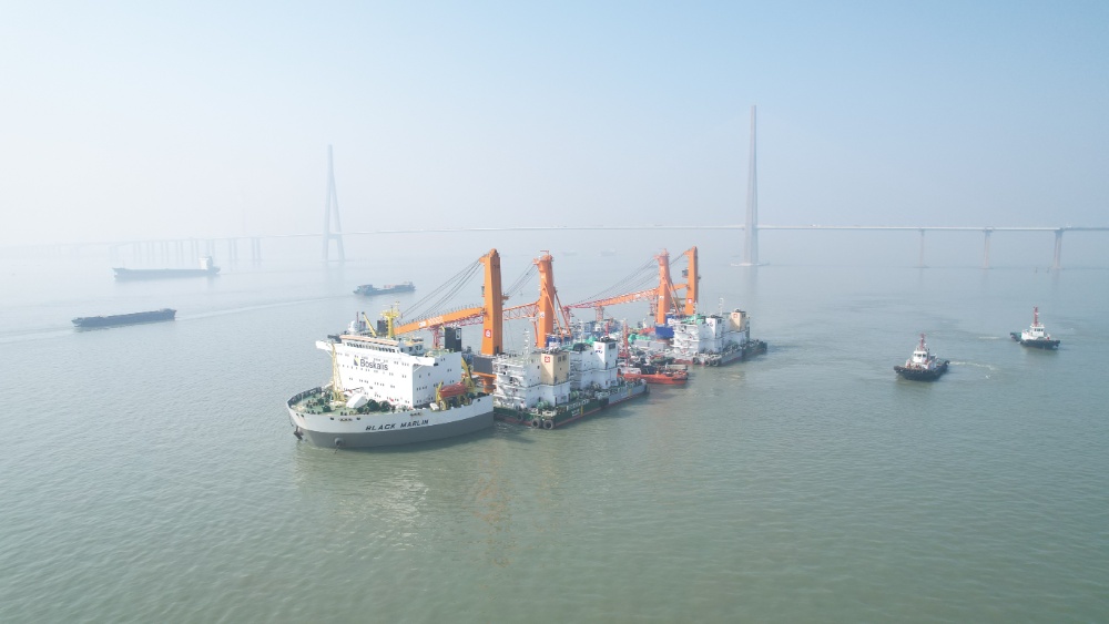 “黑枪鱼”轮系一艘载重量达5.7万吨级半潜船,总长217米,型宽42米,下潜最大吃水可达23.33米。“黑枪鱼”轮即将装载的4艘浮吊起重船和4艘拖轮——这些设备将奔赴万里之外的西非西芒杜铁矿项目,为共建“一带一路”的重要基建工程注入中国力量。这也是2026年春运启动以来,南通港口轮驳有限公司在长江下游最特殊的一次水上作业。