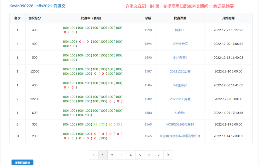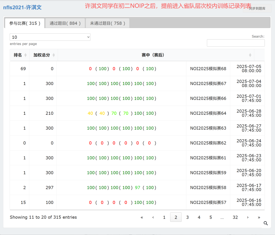 从校内OJ到QOJ、CodeForce,许淇文的训练轨迹遍布全球竞赛平台,他说:“在NOI结束之后,我的训练目标从国家集训队转向国家队,训练方向从原来的传统题转向了国家队选拔赛题型,并且增加了难度更高的模拟赛来训练以适应特殊情况,保持对难题的手感。”