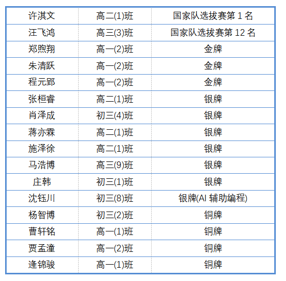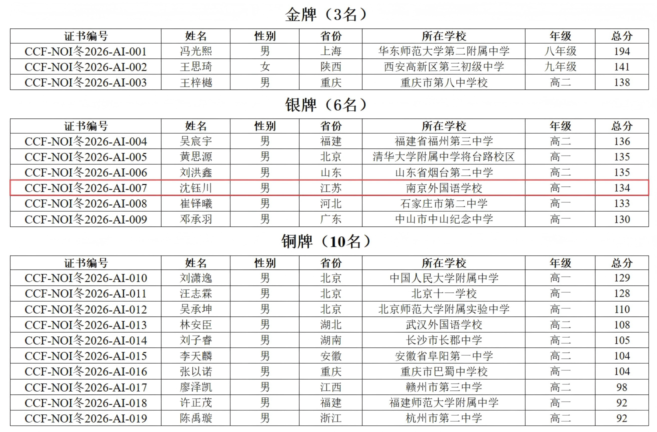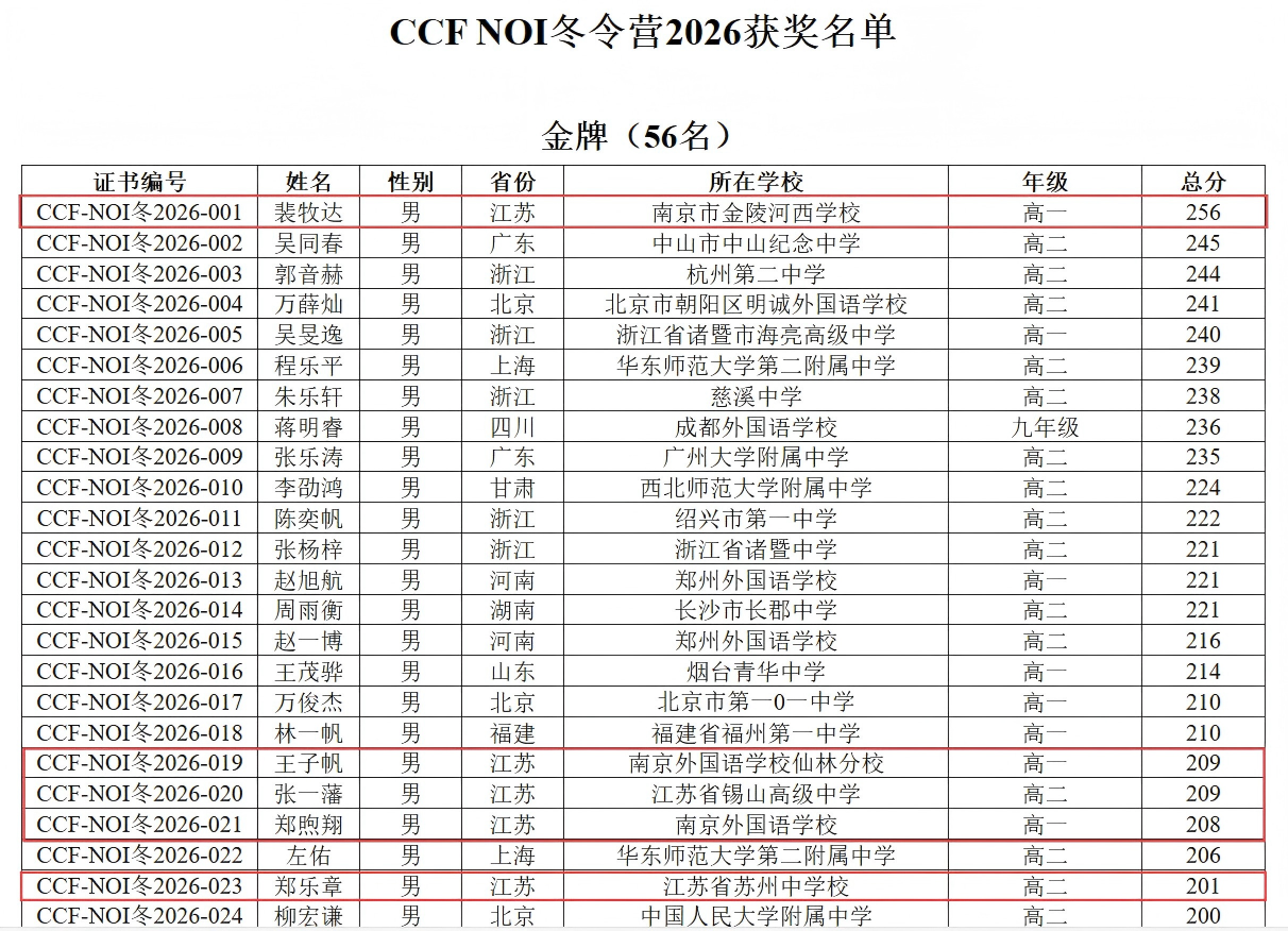 此次,南京外国语学校选手们以3金7银4铜共计14枚奖牌的骄人战绩,荣膺奖牌总数全国第一、金牌总数全国并列第二的殊荣,许淇文以最高分入选国际信息学奥林匹克(IOI)2026中国国家队。