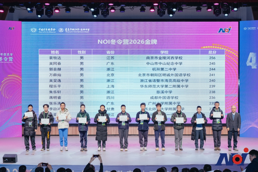 近日,由中国计算机学会主办、青岛市城阳第一高级中学承办的2026年全国青少年信息学奥林匹克竞赛(NOI2026)冬令营圆满落幕。此次NOI冬令营共有来自全国31个省区市的近800名师生参加,澳门代表队也首次亮相冬令营现场活动。经过一场测试的激烈角逐,产生金牌56名、银牌137名、铜牌147名。