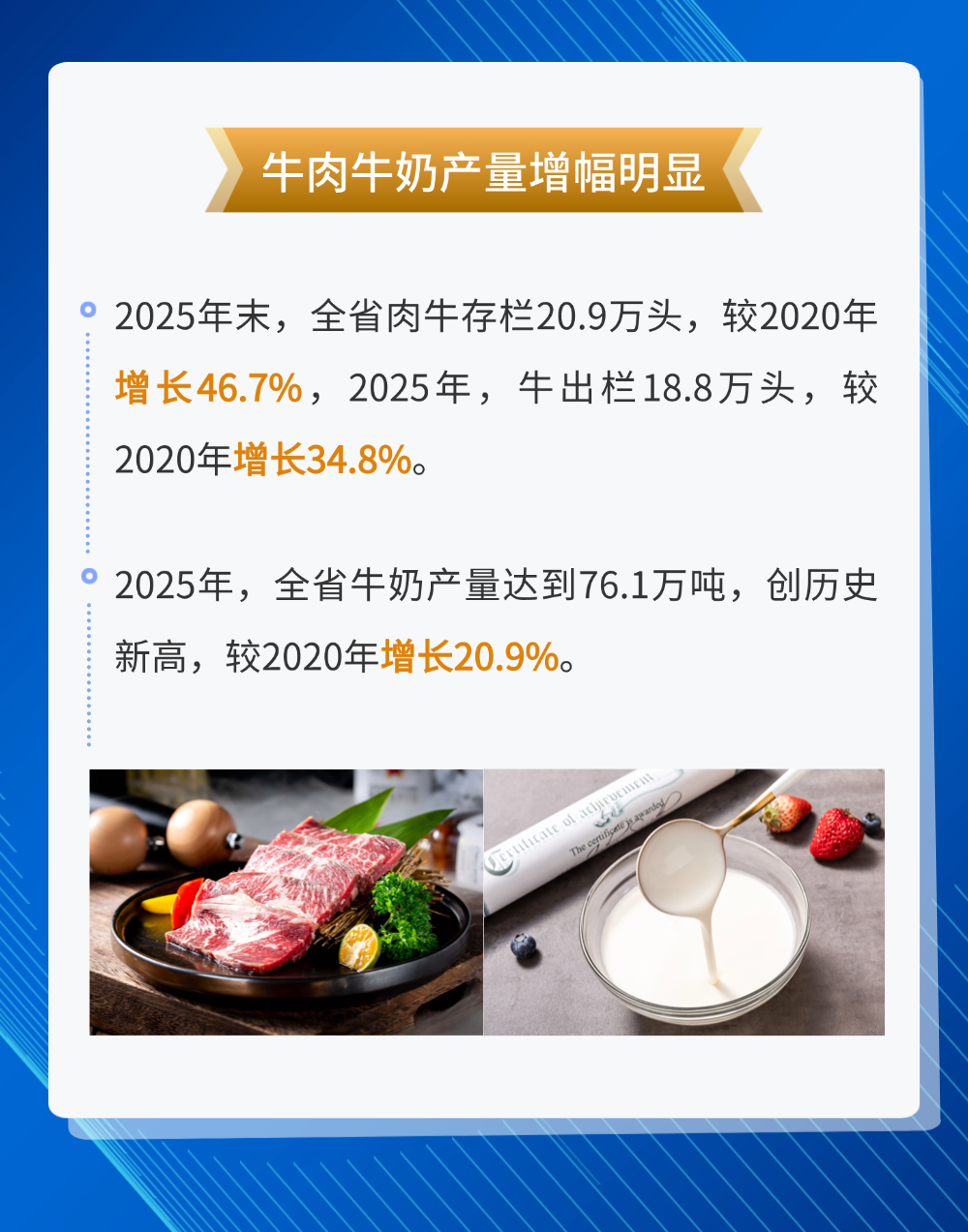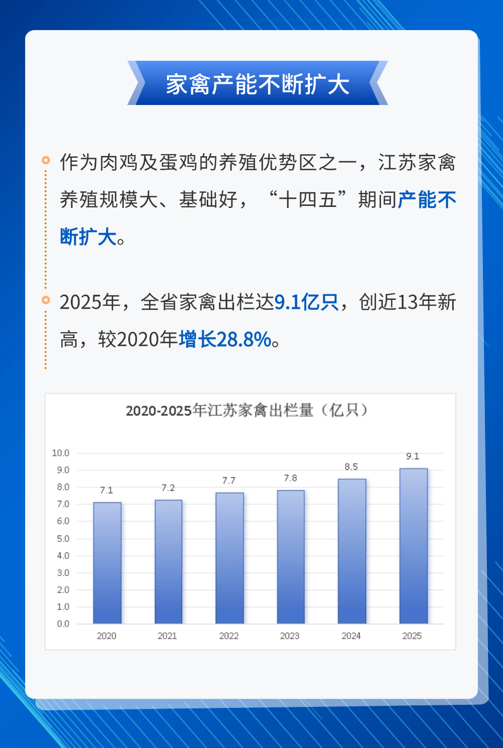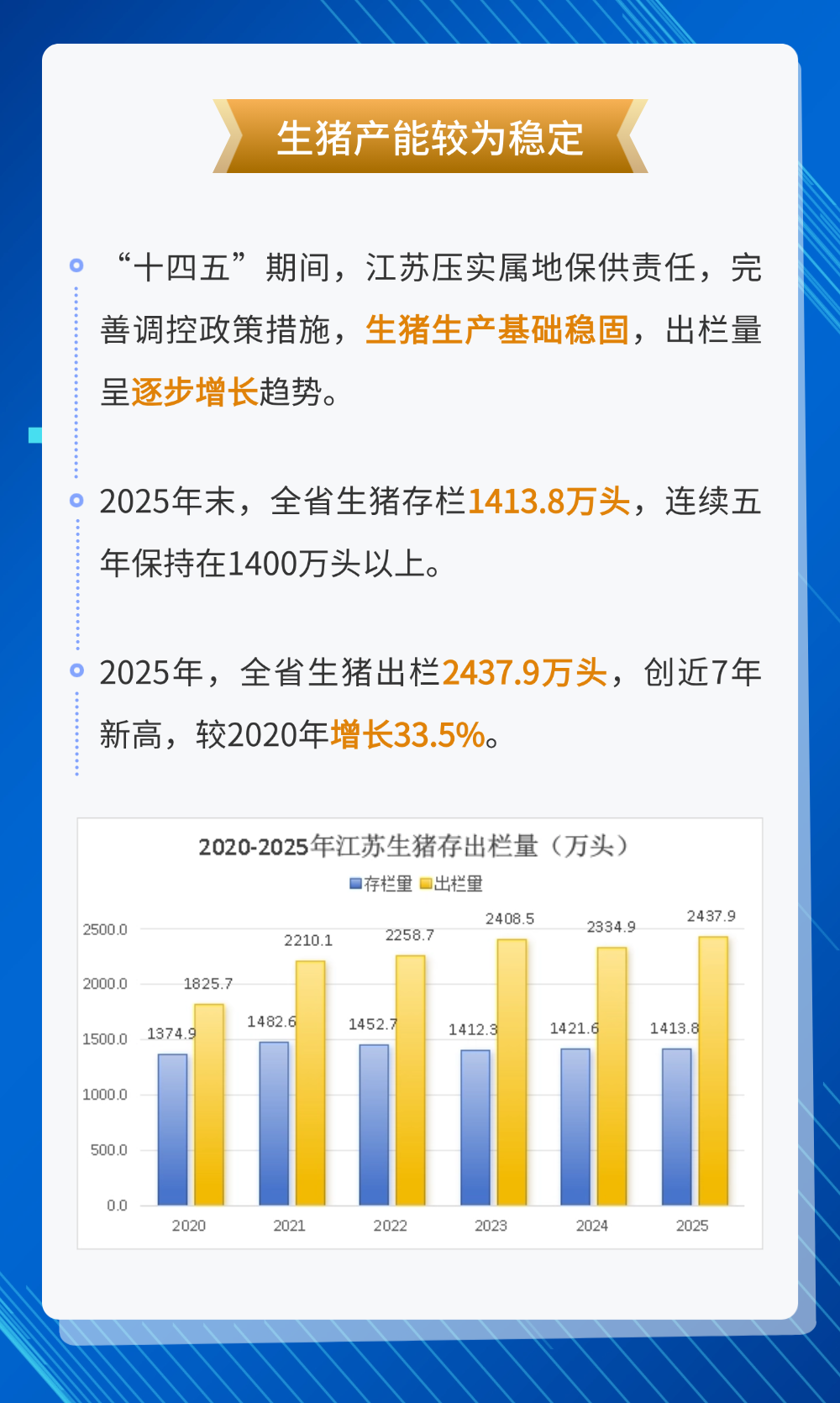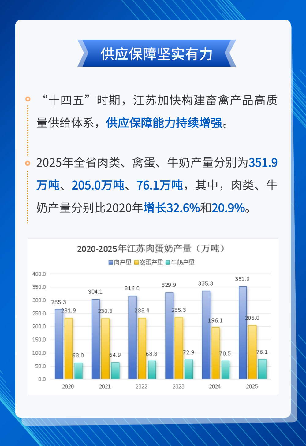 “十四五”期间,江苏坚决扛起农业大省稳产保供责任,把畜禽生产作为保障民生、稳定物价、推进乡村振兴的关键抓手。全省畜牧业稳产能、优结构、提质效、促绿色,肉蛋奶综合供给能力持续增强,多项生产指标创下新高,以坚实产业根基守护好百姓“菜篮子”,为高质量发展提供有力支撑。