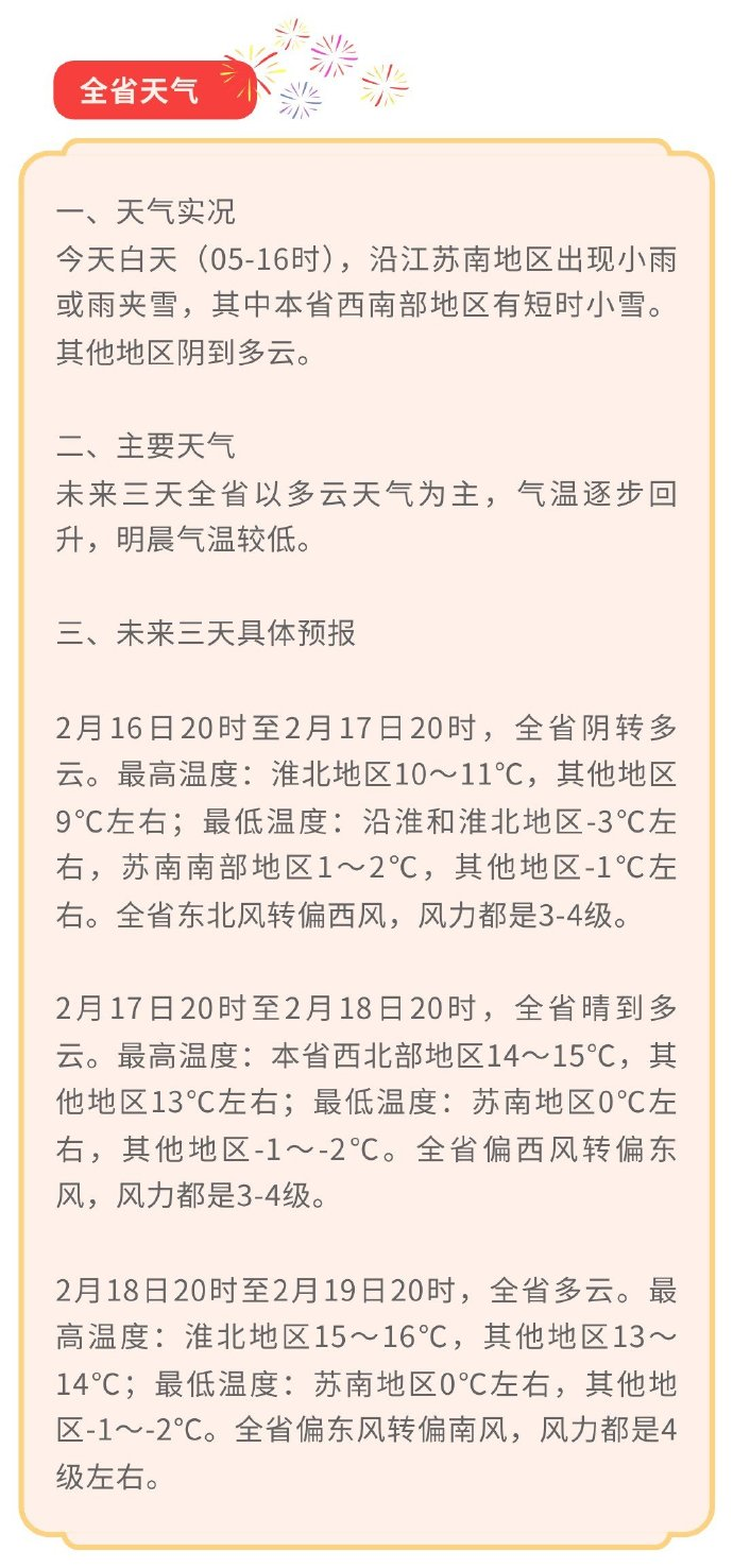 大年初三全省多云,最高气温淮北地区15至16℃,其他地区13至14℃,最低气温苏南地区0℃左右,其他地区零下1至零下2℃。