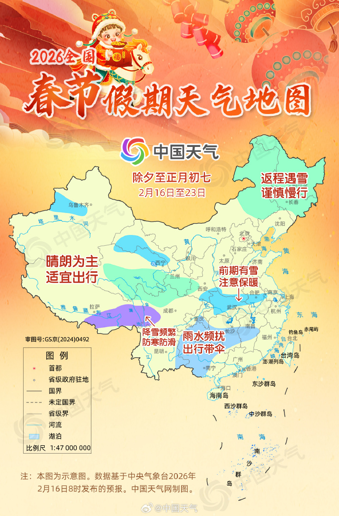 全国春节假期期间无大范围雨雪冰冻灾害天气,总体适宜出行,大部地区气温较常年同期偏高1至3℃,气温起伏较大,前期和后期有降水降温过程,中期天气条件较好。