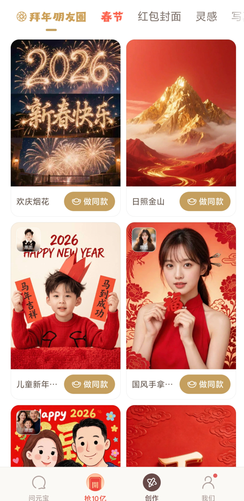 记者在某AI应用中看到,用户可以根据喜好,选择制作萌宠迎财神、大头q版拜年、马上暴富、百家姓拜年、欢庆烟花、日照金山等数十种风格的AI海报。记者选择百家姓拜年海报模板,输入“张”姓,立马就出现一幅环绕着祥云、中间一个大大“张”字的拜年海报,下面还有嵌入“张”字的祝福短句:张灯庆吉年,积福纳安康;“宋代全家福”海报模板也很好玩,上传一家三口的全家福照片,马上集体变身穿着官服的宋代人,背景是宋代书法家黄庭坚的草书,一张《太平年》风格的新春海报呈现在眼前。