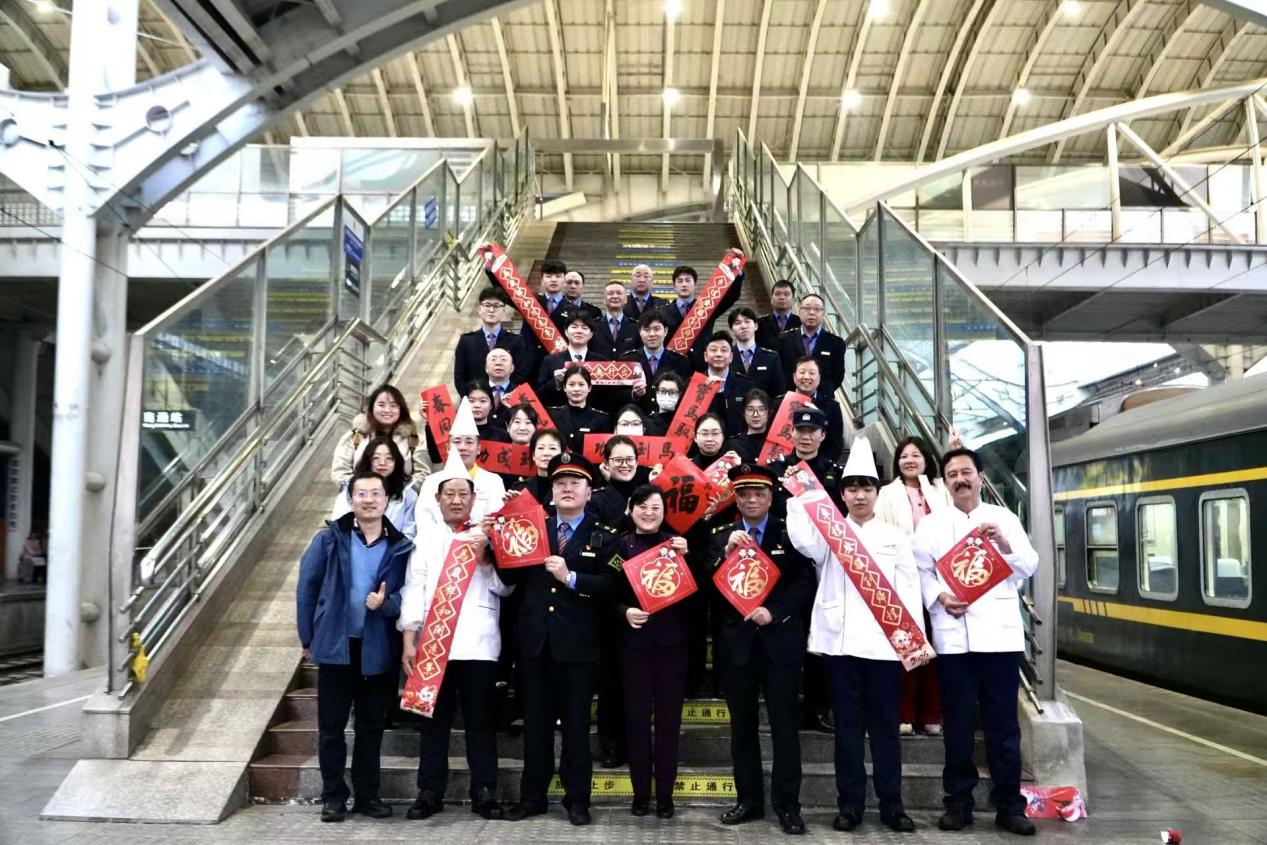 对联刚贴正,列车长就开始招呼大家合影。这是宁昆车队的“老规矩”——每逢出乘,尤其是要在外过春节的这趟车,出发前全体乘务员都要在餐车外合一张影,大家拉上对联、举着“福”字。“快快快,都过来,车队邹书记掌镜!”列车长一嗓子,大家从后厨、从车厢里聚拢过来。