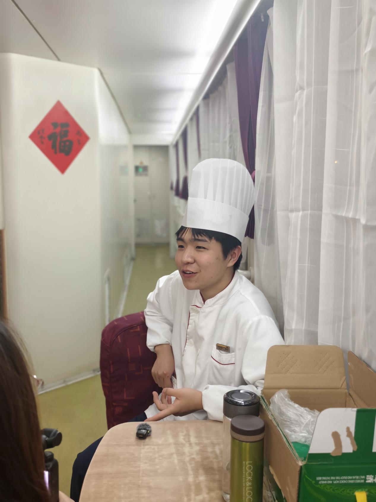 “在车上走一圈,得会‘缩骨功’。”张玲笑着拍拍身后的高晗。这个2006年出生的小伙子,今年第一次不在家过年。一个月前,他连炒鸡蛋先放油还是先放蛋都分不清,如今已能在后厨打下手,还能帮着师傅推车去车厢叫卖。
