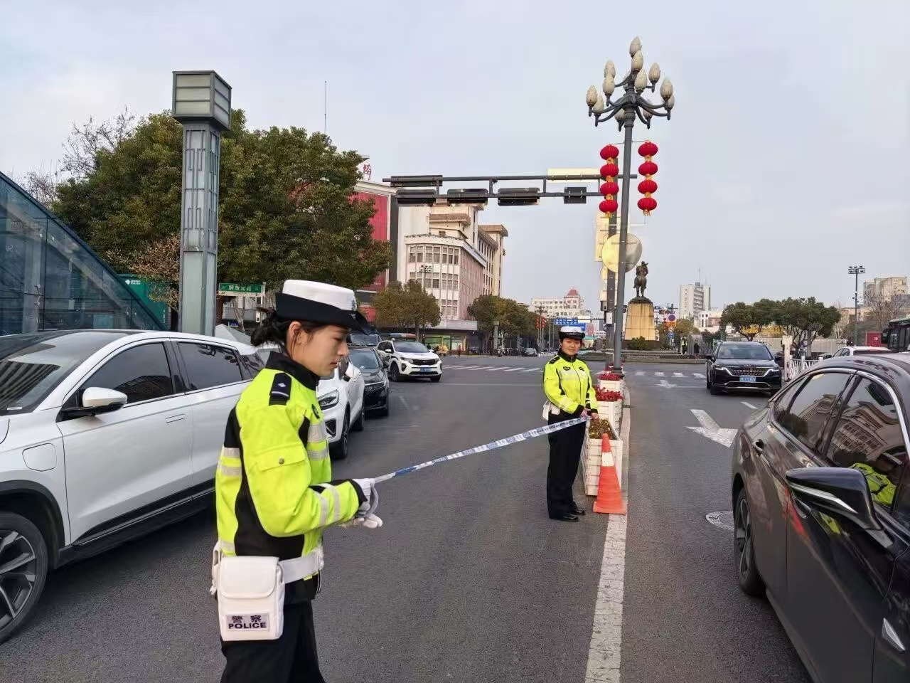 今年是姐妹俩第一次春节执勤,早上七点半,唐华文就穿上荧光绿交警制服,早早来到现场。因实现临时交通管制,从大铜马到北金鹰约300米的道路,她来回往返,提前引导驾车前来的观众在指定停车位停车,提醒周边居民车辆避开建军路绕行。有游客问路,她耐心回答并笑着道一句“新年好,平平安安”,碰到小朋友,还会送上一颗糖果。这份从容、游刃有余的背后,是演出前她和同事一遍遍实地测算,摸清楚巡演队伍的行进时间、人流聚集节点的车辆通行需求,规划出核心封闭区、外围疏导区与应急通道。巡演路线上每一个锥桶的摆放、每一段护栏的长度,也都经过了仔细考量,为的是给节日的热闹铺好畅通安全的“跑道”。