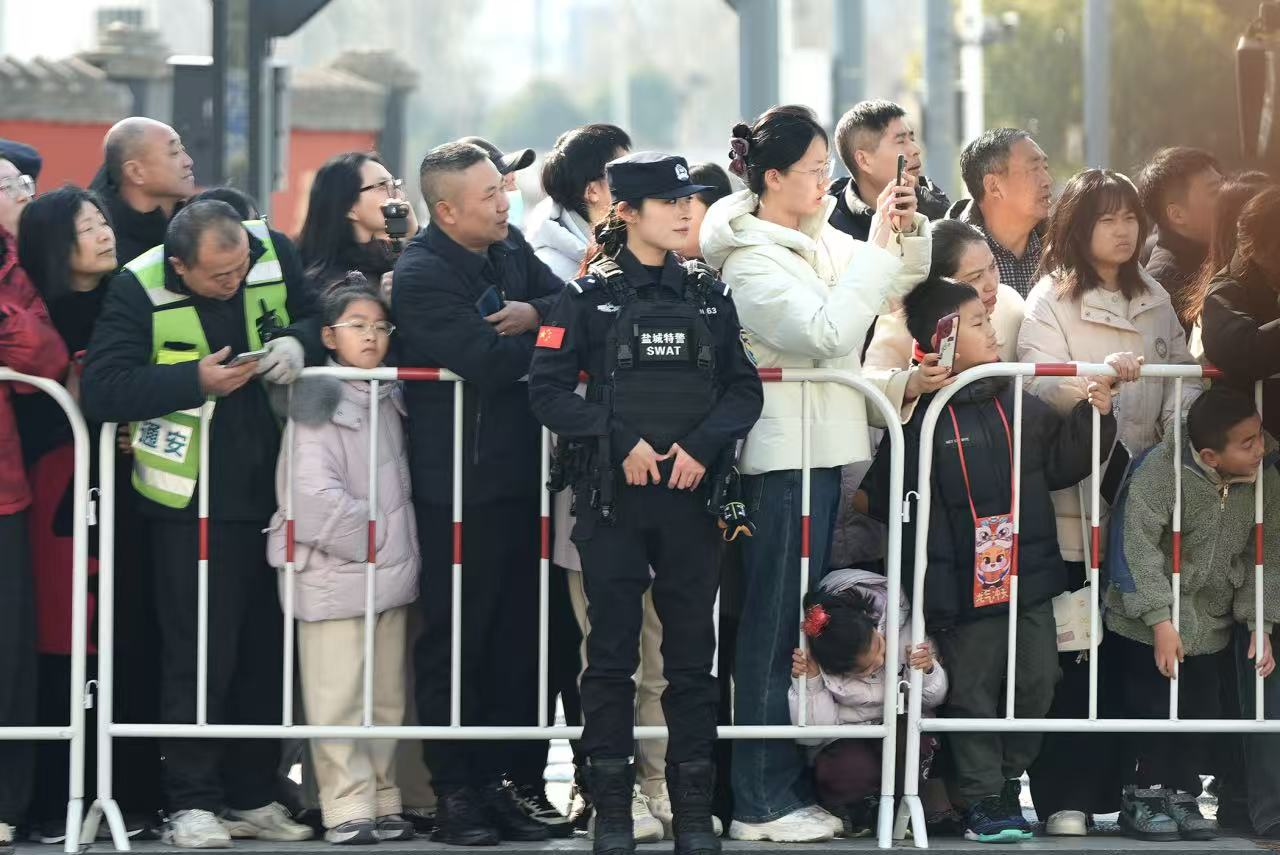 在盐城,有一种年味叫“踩街”。大年初一上午,喧天欢乐的锣鼓声中,打莲湘、荡湖船、踩高跷、旱驴等踩街队伍沿着建军路一路巡游、载歌载舞,街两边站满了携家带口的观众。人群中,盐城市公安局交管支队亭湖大队巾帼中队民警唐华文和巡特警支队大型活动安保大队民警潘伟洁却无暇欣赏演出,她们一个守在路口引导人流车流通行,一个穿梭在人群中巡逻守护。
