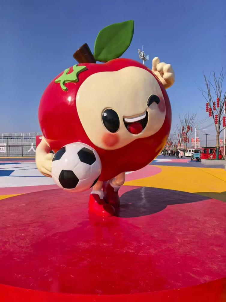 记者在市集里注意到,一个摆满了可爱玩偶的摊位前挤满了大小朋友。这里售卖的正是“村界杯”文创产品——吉祥物“沛小鞠”。这个圆滚滚的小家伙,以传统蹴鞠为核心设计灵感,结合沛县特产苹果与足球运动元素,用萌趣的形象搭配灵动的踢球动作,彰显着乡村足球的蓬勃活力。