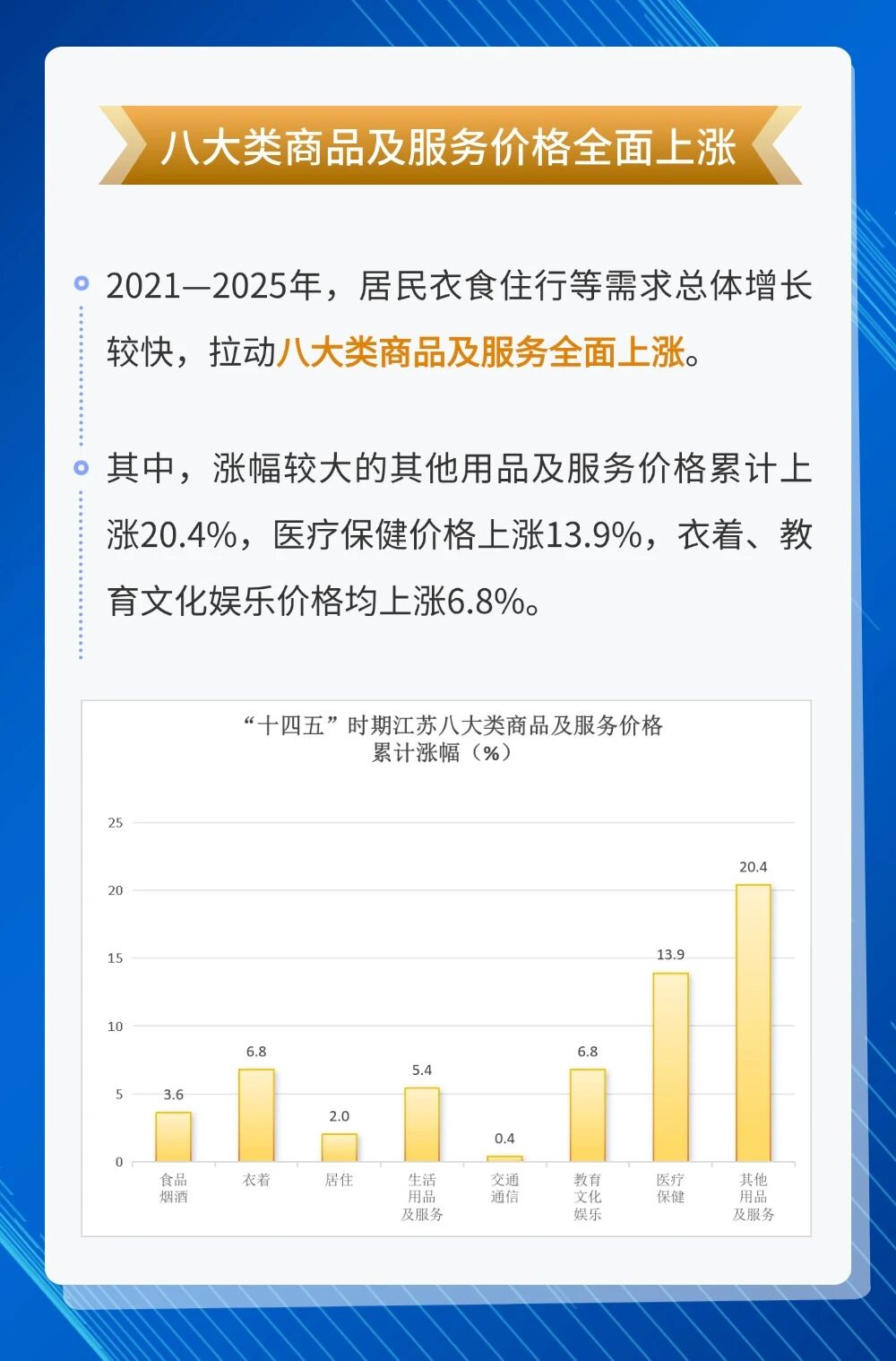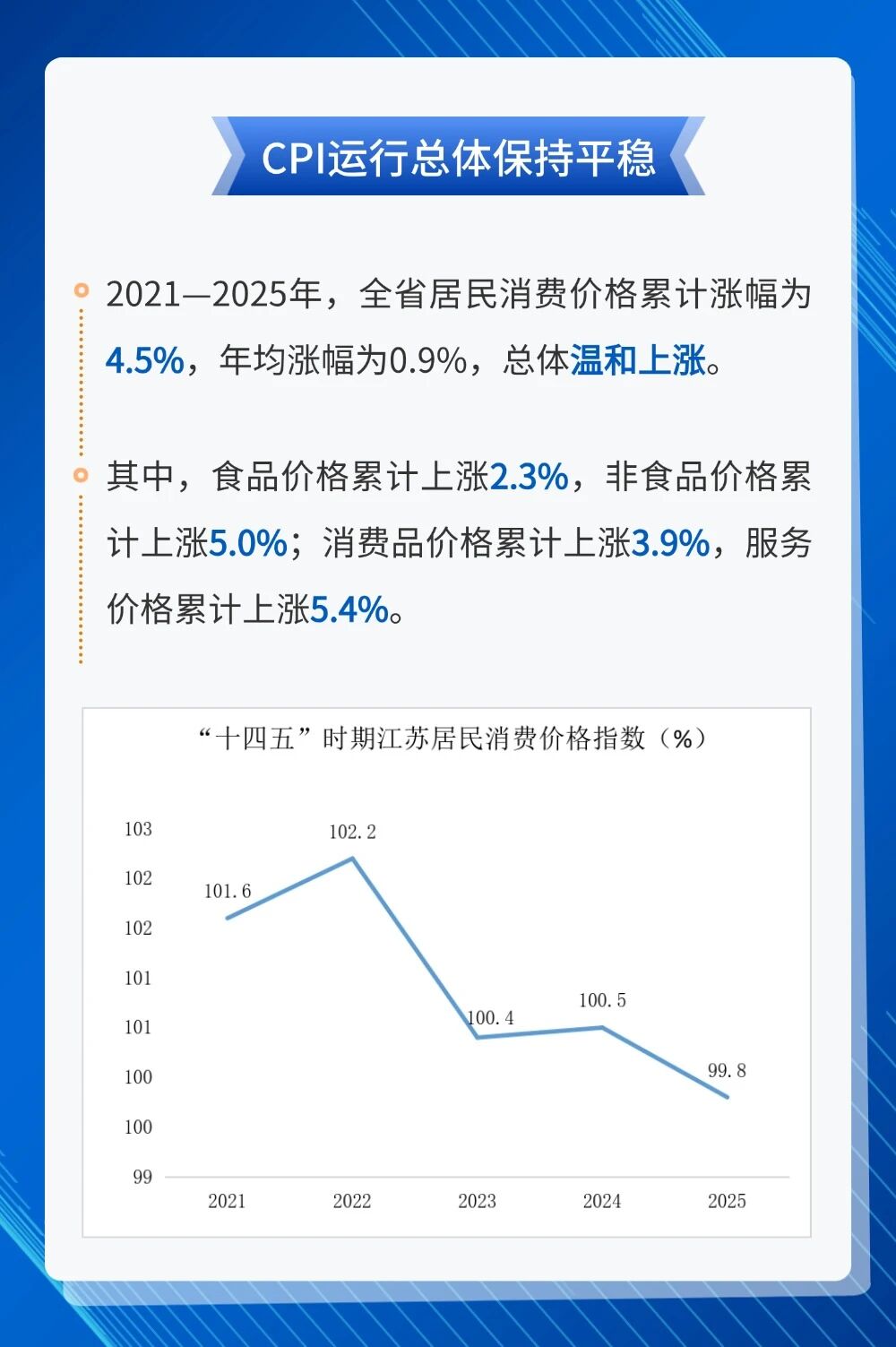 “十四五”时期,江苏坚持把惠民生与促消费有机结合,经济结构持续优化、发展动能加快转换,整体呈现稳中有进、韧性增强的良好态势,全省居民消费价格总体保持温和上涨运行态势。