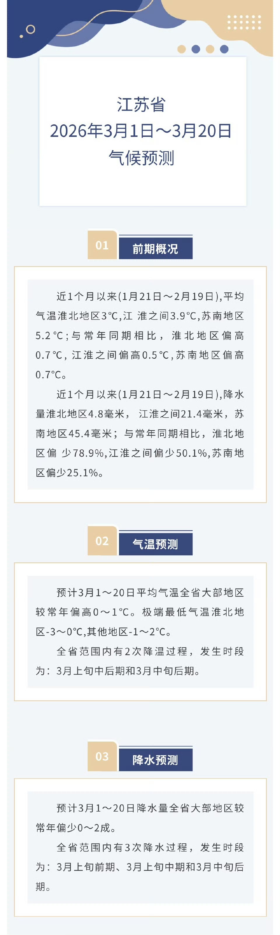 预计3月1日至20日,江苏全省大部平均气温较常年偏高0~1℃,极端最低气温淮北地区-3~0℃,其他地区-1~2℃,期间有2次降温过程,分别出现在3月上旬中后期和3月中旬后期。降水量方面,全省大部较常年偏少0~2成,有3次降水过程,时段为3月上旬前期、上旬中期以及中旬后期。