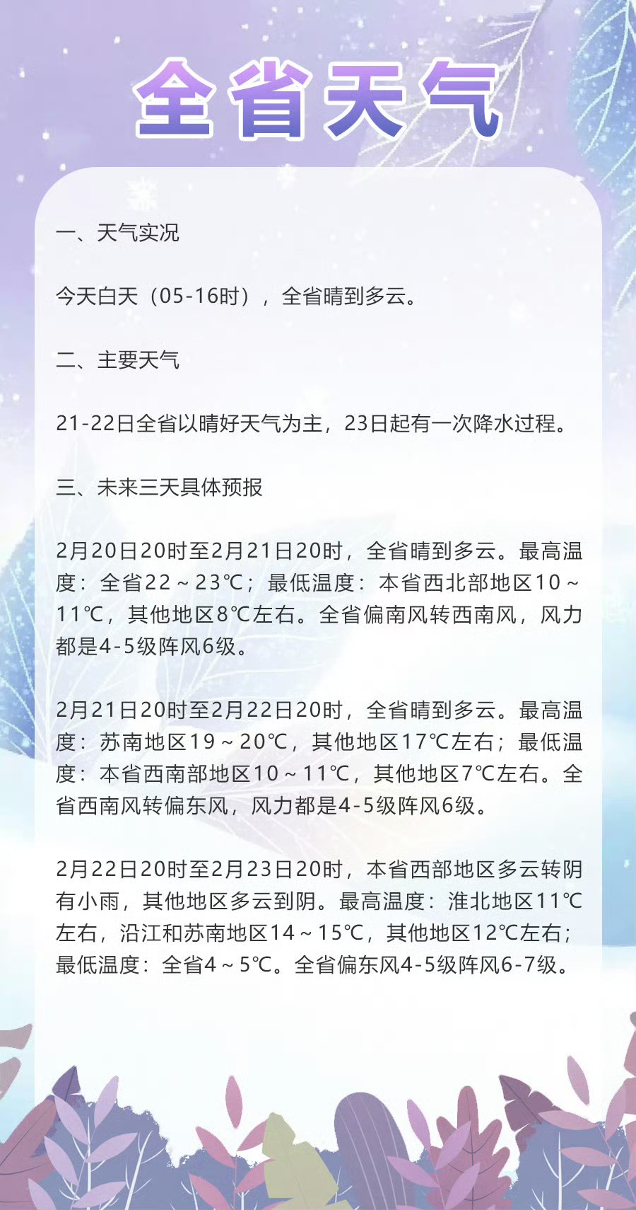 2月20日20时至2月21日20时,江苏全省晴到多云,最高温度22~23℃,最低温度西北部地区10~11℃,其他地区8℃左右,全省偏南风转西南风,风力4-5级阵风6级。2月21日20时至2月22日20时,全省晴到多云,苏南地区最高温度19~20℃,其他地区17℃左右,最低温度西南部地区10~11℃,其他地区7℃左右,西南风转偏东风,风力4-5级阵风6级。2月22日20时至2月23日20时,江苏西部地区多云转阴有小雨,其他地区多云到阴,淮北地区最高温度11℃左右,沿江和苏南地区14~15℃,其他地区12℃左右,最低温度全省4~5℃,偏东风4—5级阵风6—7级。