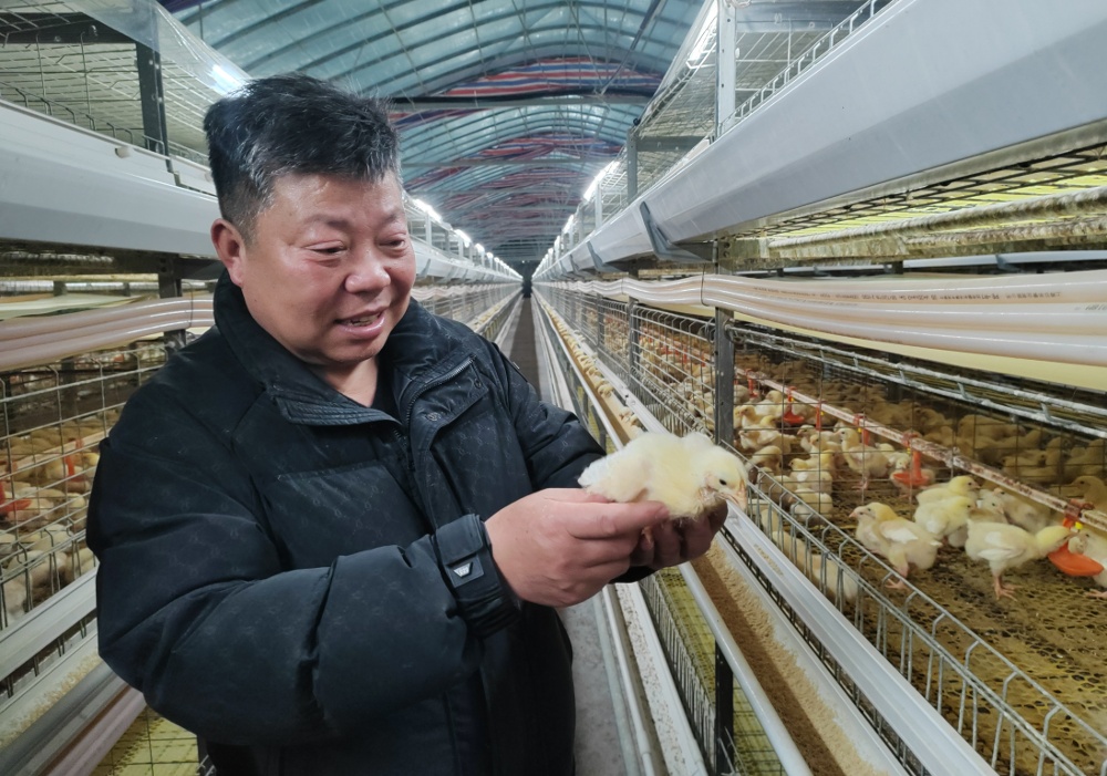 从清晨六点到深夜十点,检查温湿度、调配饲料、添水清粪、观察雏苗活跃度……赵荣兵的春节被这些忙碌而琐碎的工作填满,没有亲友团聚的推杯换盏,唯有大棚内恒定的暖意与雏苗的欢叫相伴。“你听,这叫声多有劲儿,等它们出栏了,乡亲们的工资就有了着落,村集体经济也能再添一笔。”他站在鸡舍中央,望着满棚探头探脑的雏苗,眼里满是期许,“守好这些‘致富苗’,就是守住了乡村振兴的希望,这个年过得值!”