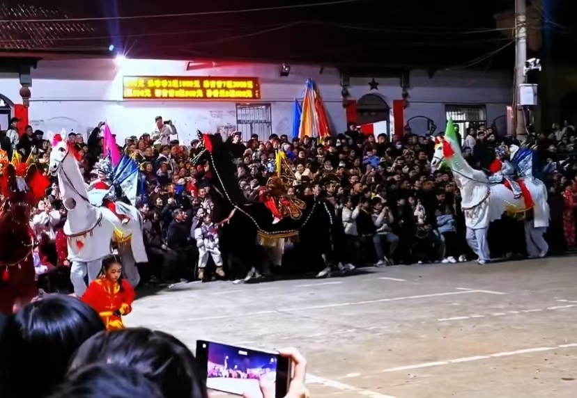 灯光打在彩色的马身上,那些竹篾扎成的马,糊着彩绸,系着铜铃,在光影里活了过来。仔细看,每一匹马下,竟有三个人。中间一人擎着马首,后面两人共撑马身,三个人,六条腿,配合得天衣无缝,竹马因舞动的人而有了生命。