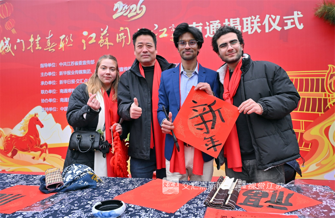 2月10日,南通市崇川区和平桥街道开展楹联文化漫步体验活动,吸引众多“江海拾遗Go崇川”国际传播推荐官和南通大学国际教育学院的留学生,走进钟楼、寺街、南大街商圈等地标性点位,沉浸式体验中国年俗文化。李斌 穆辉颖 摄 视觉江苏网供图