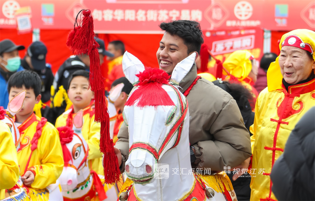 2月21日,南通市崇川区,“骐骥骏驰乐通城”2026南通新春民俗巡游活动在南大街商圈隆重举行。新春民俗巡游吸引了众多“歪果仁”参与和观赏,品味体验中国新春民俗文化。李斌 摄 视觉江苏网供图