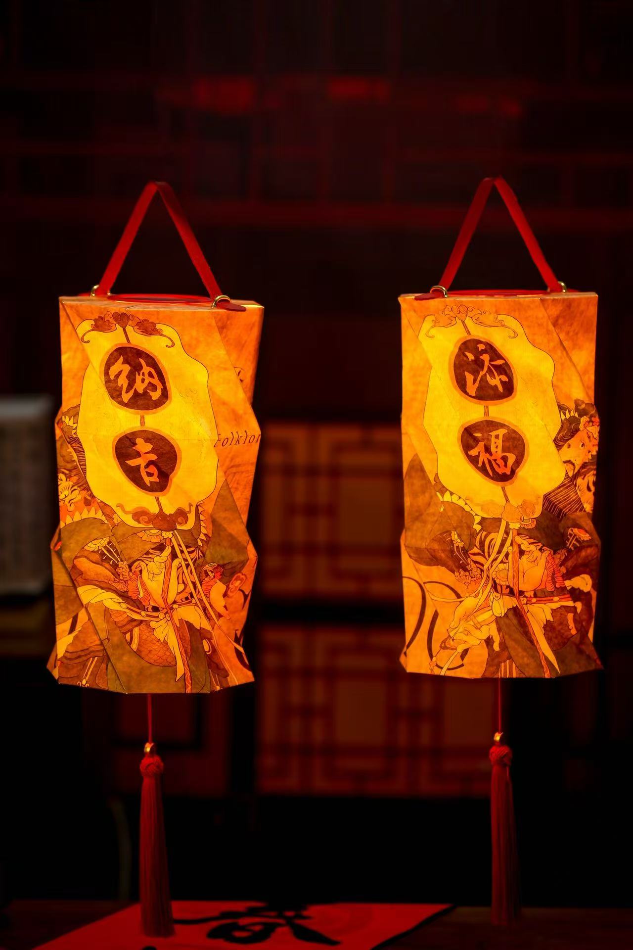 作为2024年夫子庙文旅招商引入的文创品牌,集吉文创的折叠灯已斩获多项行业大奖。“我们的折叠灯纯手工制作,核心材质选用杜邦纸,防水又防潮,可适合办公室、茶室、床头等多种场景。”黄雨杰介绍。为了适配不同人群,折叠灯还推出了多款兼具年味与地域特色的限定款式。其中,新春应景的“添福纳吉”款,由团队与杨家埠木版年画省级非遗代表性传承人杨志滨联名打造而成。设计融入传统门神元素,高饱和色调的服饰搭配抽象化兵器,既保留威严气韵,又兼具潮流美感。此外,专为南京量身定制的“梦回金陵”款,将秦淮河、明城墙的美景印刻灯上,既是氛围感摆件,也是独具意义的伴手礼。