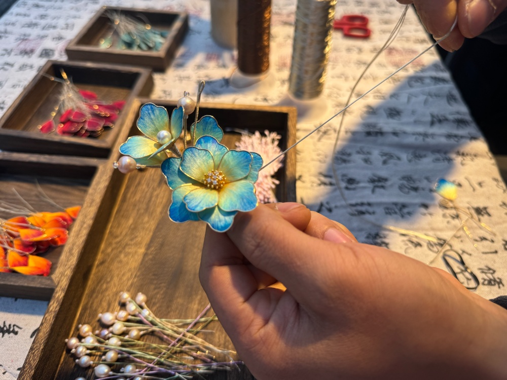 “除了参加市集外,我大部分时间都在潜心研究作品。”“梅里好市”绒花缠花摊主陈浩介绍,今年他的作品一改以往纯传统风格,向现代风转型。例如将传统扁款牡丹升级为立体造型,把传统细绒工艺改为掐丝工艺,让作品更立体坚挺,也更耐用。同时,他还将绒花、缠花两项非遗技艺融合创新。陈浩认为,只有主动贴近年轻人的喜好并融入创作,才能在市集上吸引更多游客。