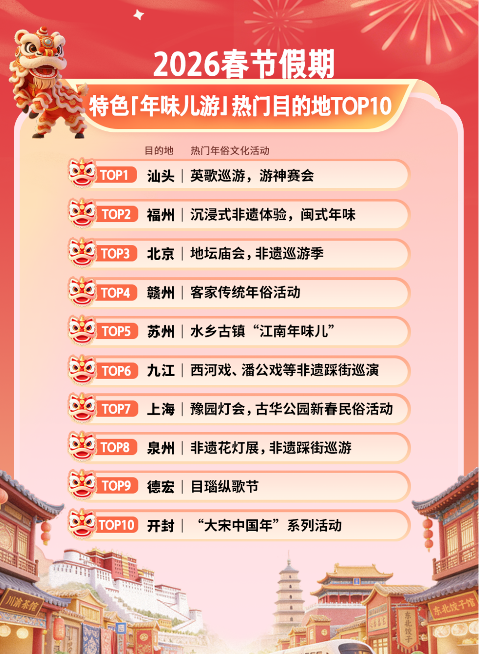 同期上榜的热门城市还包括汕头、福州、北京、赣州等。潮汕地区的游神赛会、英歌锣鼓等非遗活动同样热度高涨,南北年俗交相辉映,营造出红红火火的节日氛围。