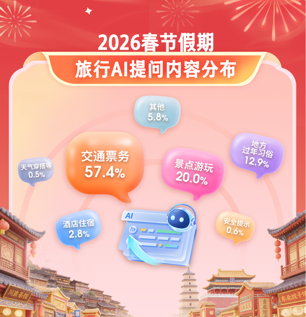 今年春节,科技元素融入旅游消费,“跟着AI过大年”成为新时尚。问行程、搜景点、查攻略、问天气, AI已经成为出游必不可少的“搭档”。同程旅行旗下旅行智能体DeepTrip数据显示,有关春节的提问当中交通票务相关问题占比约57.4%,景点游玩相关内容占比约20%,地方过年习俗相关内容占比约12.9%。