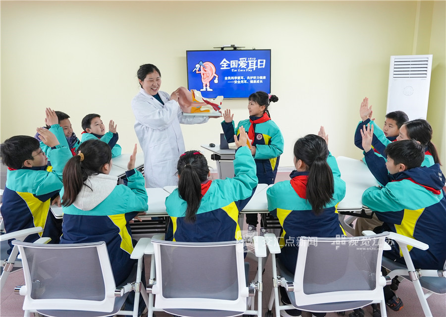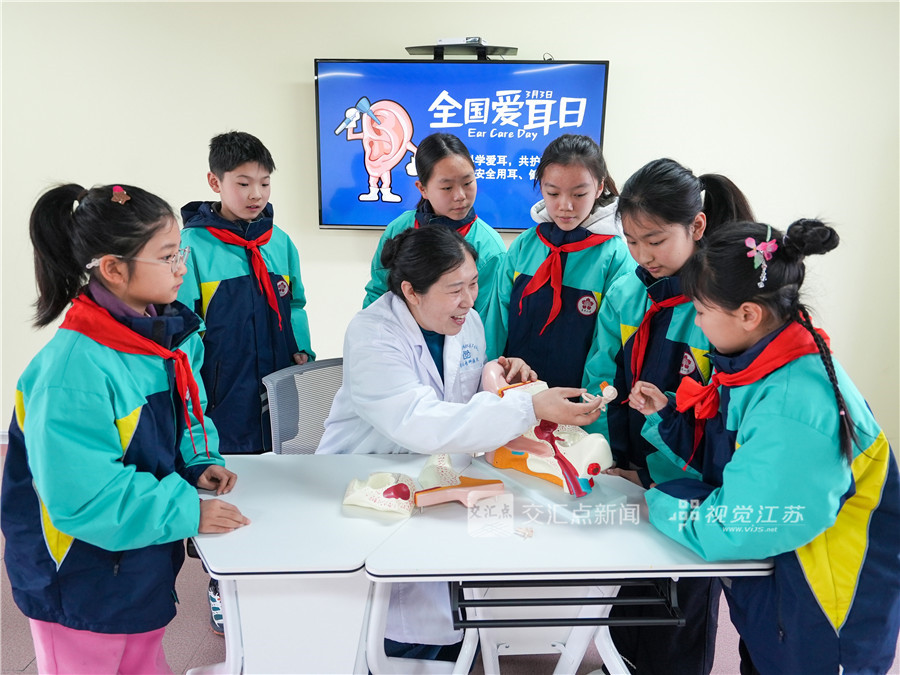 (特约摄影 周社根 08:54摄 09:03上线)3月2日,在泰州市姜堰区天目山街道康华社区党群服务中心,医护人员给泰州市姜堰区康华小学的学生讲解耳朵构造及科学护耳知识。今年3月3日是第27个全国爱耳日,主题是全民科学爱耳,共护听力健康。