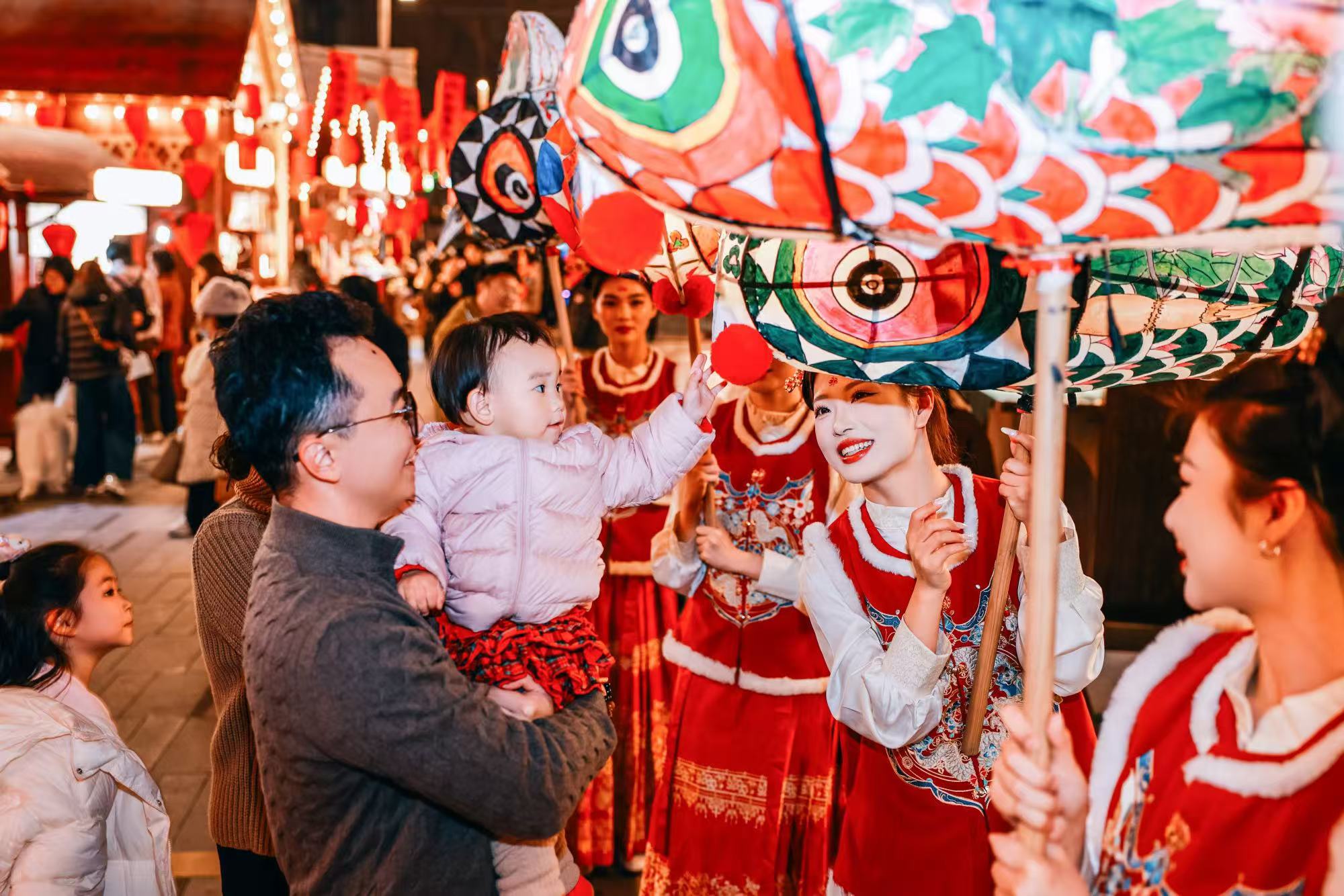 这里是南京最繁华的“中华第一商圈”,正值周六晚高峰,客流量渐增。但此刻,不少人的目光从奢侈品橱窗上移开,被一支手持五彩鱼灯的队伍牢牢牵引。常言“年年有余”,当起源于安徽的古老非遗鱼灯“游”进购物中心,这尾“鱼”不仅带来了年味,也成了观察新春消费市场的一扇窗口。