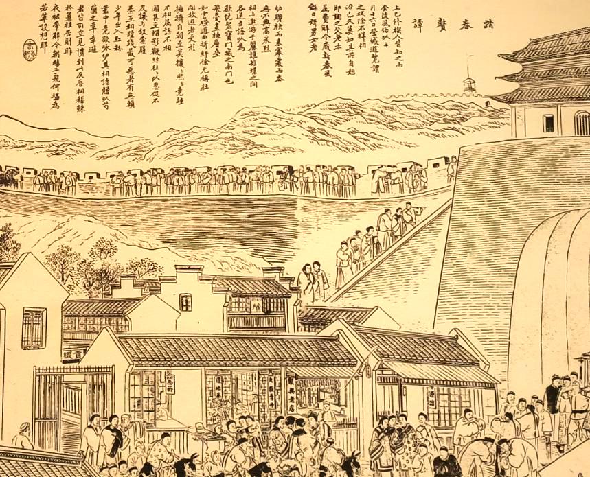 在南京,类似“走三桥”的民俗叫“走百病”“爬城头”,时间是在元宵节的第二天——正月十六。“爬城头”活动中,人气最旺的是石城门(旱西门)、三山门(水西门)、聚宝门(中华门)、通济门4段城墙。民国学者夏仁虎《岁华忆语》载:“(南京)城上马道,亦市玩物,以棘枝上安红豆,及炒米花,游人购之而归”,各种卖小吃、卖花灯的小商小贩瞅准商机,让古老的城墙变身为热闹集市。