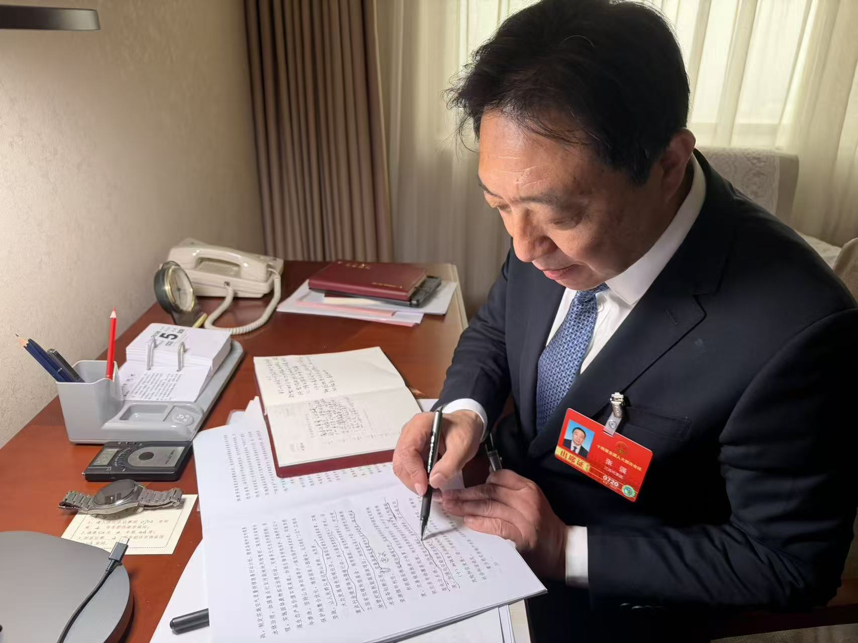“发展新型储能”“推广绿电应用”,对重点作了标记的这12个字,张强亦有了针对性思考。“这几年迎峰度夏,储能为江苏生产生活用电发挥关键作用,必须以高标准带电作业保障储能设施稳定运行,让电能‘存得进、放得出、供得上’。”笔记本上“绿电调解员”这五个字,是张强给自己的“新角色”。他表示,针对绿电推广中的邻里协调等现实难题,将在今后履职中用耐心沟通与专业服务打通落地“最后一公里”。