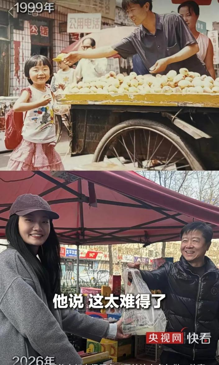 一张老照片能给我们带来怎样的感动?近日,网络上一张27年前与陌生人的合影火了。抖音用户@-MangoOo-将分别摄于1999年、2026年与同一位水果摊主合影的对比照分享在社交平台,获得近200万点赞、数十万转发。画面主题十分朴素,是“买水果”。为何如此看似微不足道的小事却引发如此多网友共情?这份陌生人之间的温情为何能如此戳中人心?