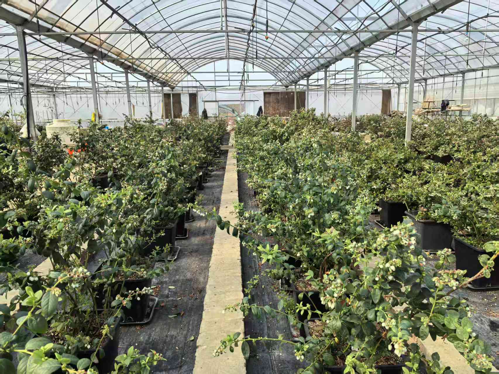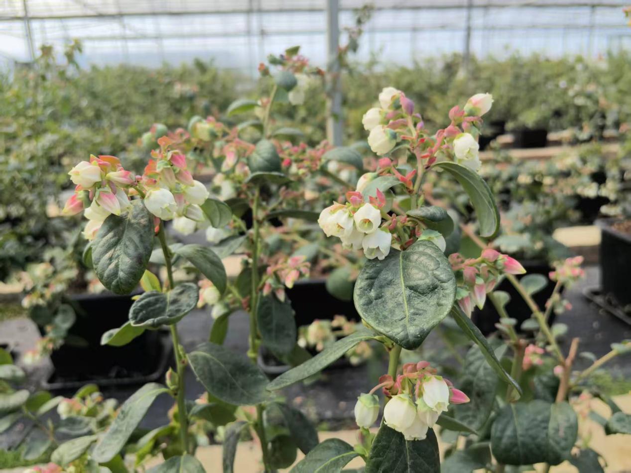 大棚里的蓝莓采用的是基质盆栽,一垄两排,整整齐齐。地头的小牌子上标着品种,正值盛花期,酷似铃兰的白色小花,簇拥在枝头,几只胖嘟嘟熊蜂正忙着授粉。