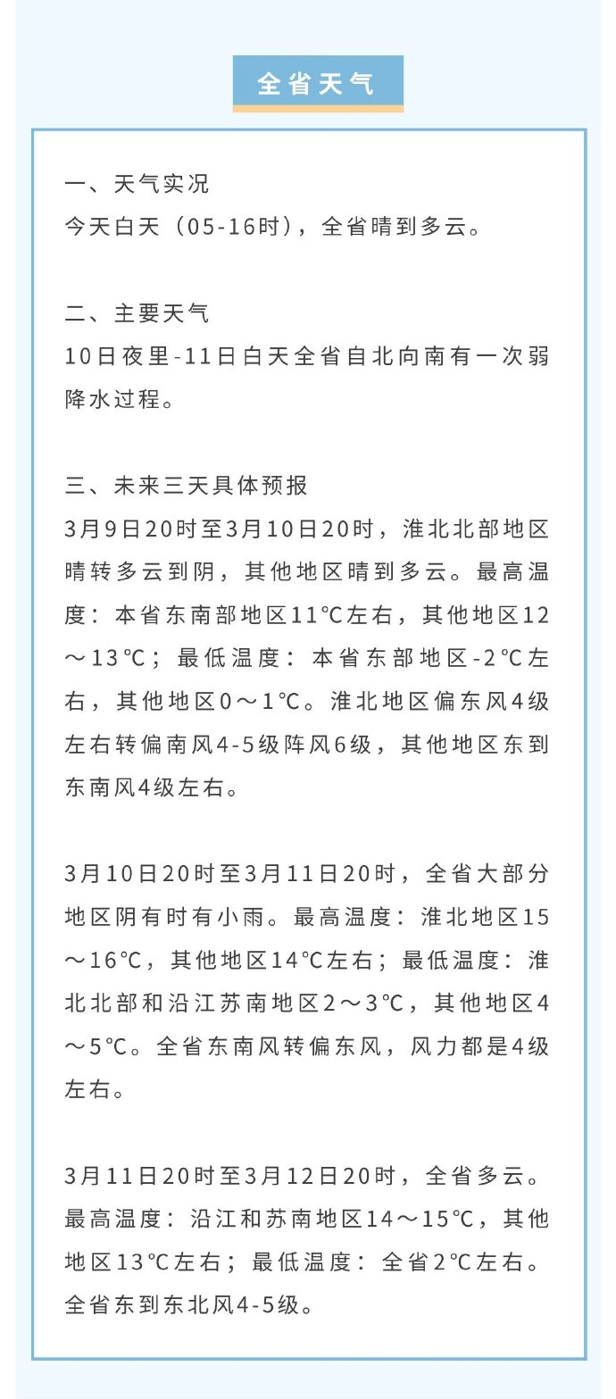 3月11日20时至3月12日20时,全省多云。最高温度:沿江和苏南地区14~15℃,其他地区13℃左右;最低温度:全省2℃左右。全省东到东北风4—5级。