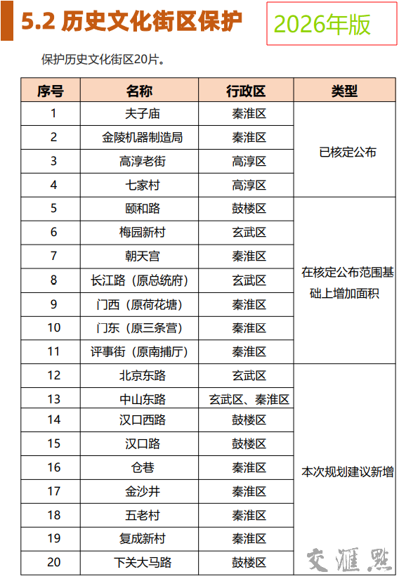 历史文化街区数量拟扩大近一倍。南京将加强对历史文化街区、历史地段整体风貌的保护和延续;历史文化街区、历史地段的保护范围内,以及重要文物古迹临近区域,新建必要的基础设施应与相应的历史风貌相协调。