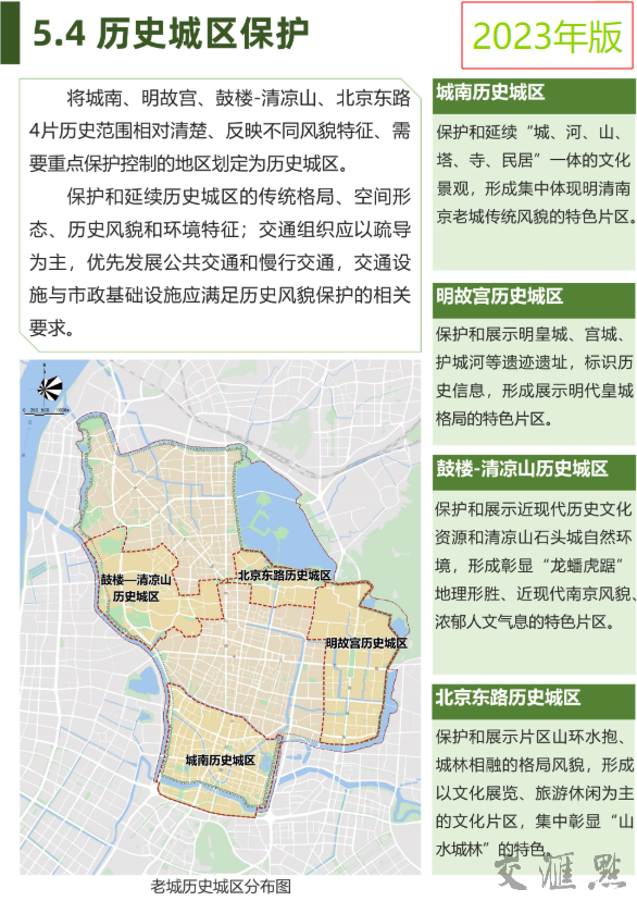 此前2023年版本新增北京东路历史城区,共划定鼓楼—清凉山片区、老城南片区和明故宫片区等四个历史城区,城墙内超一半面积被列入保护。