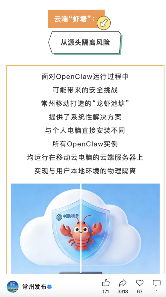常州率先推出云端“龙虾池塘”,探索把OpenClaw部署在云端服务器中,与用户本地环境进行物理隔离,在降低使用门槛的同时,尽可能减少数据泄露风险;不仅提供免费试用名额、云电脑账号和模型接入,还预装办公场景所需的多项扩展技能,让“养龙虾”从一项高门槛的技术操作,变成了一项触手可及的公共服务。