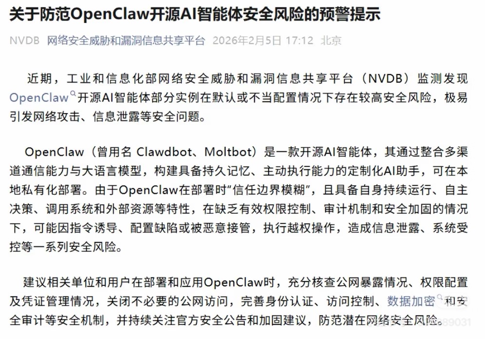 2月,工信部网络安全威胁和漏洞信息共享平台发布提示,OpenClaw在默认或不当配置下存在较高安全风险,可能引发信息泄露、系统被控等问题。