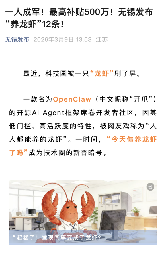 3月9日,江苏无锡、常州两地更是由官方下场“送龙虾”,无锡甚至开出了最高500万的“养龙虾”补贴。