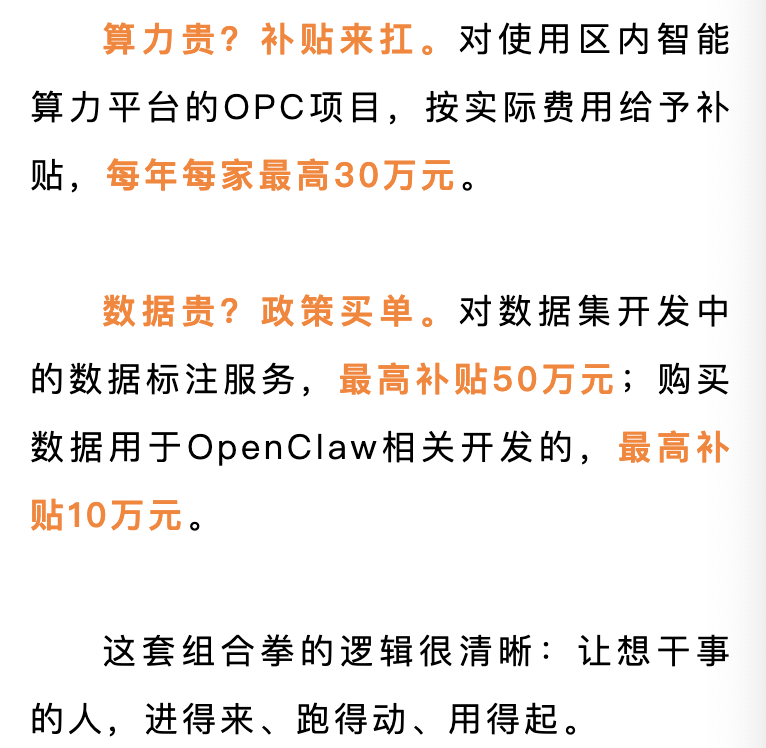 无锡高新区则更进一步,拿出“真金白银”,发布支持OpenClaw发展的12条措施,从免费部署、算力和数据补贴,到人才支持、房租减免,再到“AI+制造”和安全合规,单项最高支持到500万元,形成了一套较为完整的政策支持体系。