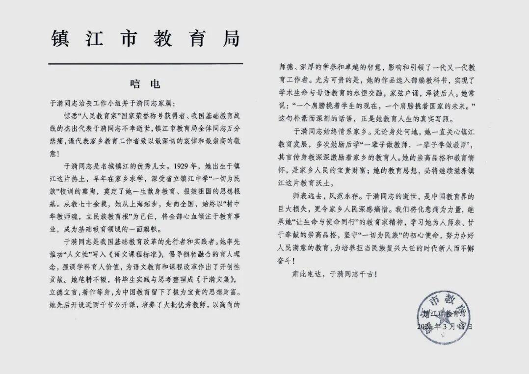 镇江市教育局唁电表示:师表远去,风范永存。于漪同志的逝世,是中国教育界的巨大损失,更令家乡人民深感痛惜。我们将化悲痛为力量,继承她“让生命与使命同行”的教育家精神,学习她为人师表、甘于奉献的崇高品格,坚守“一切为民族”的初心使命,努力办好人民满意的教育,为培养担当民族复兴大任的时代新人而不懈奋斗!