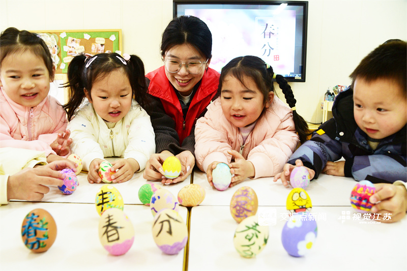 3月19日,太仓市城厢镇幼教中心元美幼儿园的老师为小朋友讲解春分立蛋民俗,感受民俗文化魅力。计海新 摄 视觉江苏网供图