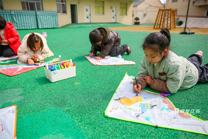 3月19日,如皋市吴窑镇吴窑幼儿园的孩子在老师指导下,体验绘彩蛋、制风筝、放风筝等传统民俗,在动手实践中感受传统文化魅力。徐慧 摄 视觉江苏网供图