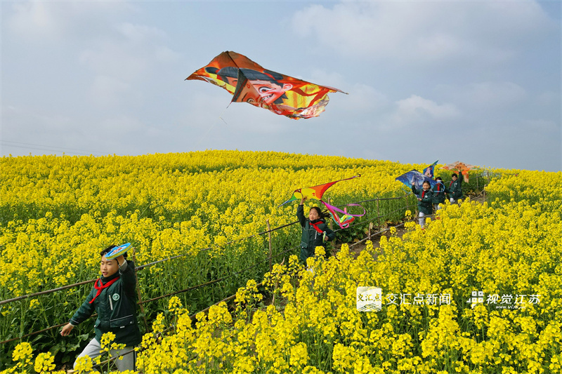 3月19日,东台市实验小学组织学生在油菜花海里放风筝,亲近自然,感受春天气息。练益华 王恒生 摄 视觉江苏网供图