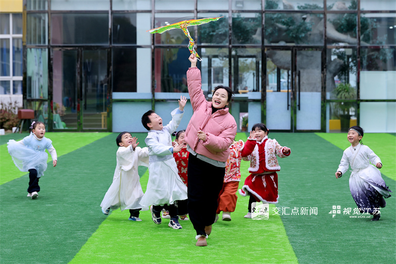3月19日,淮安市洪泽湖幼儿园,老师带着小朋友放风筝,学习春分节气知识,感受传统文化的魅力。殷潮 摄 视觉江苏网供图
