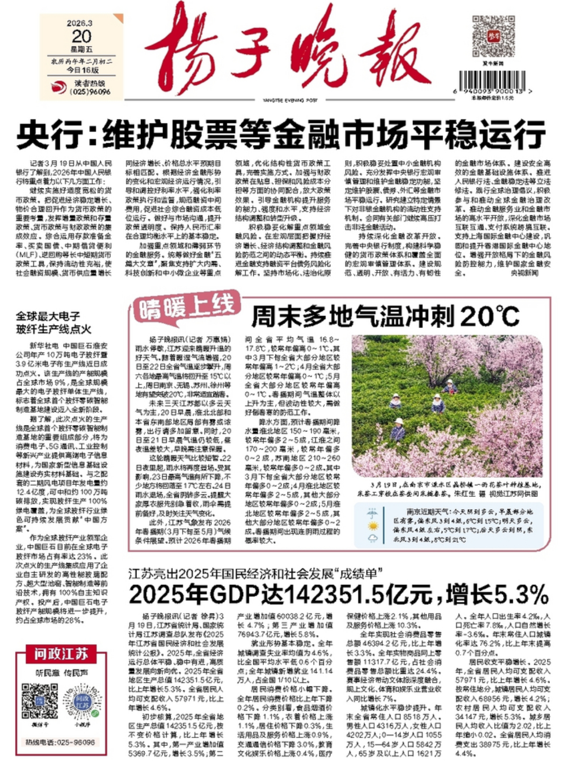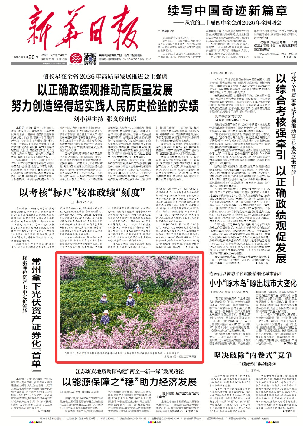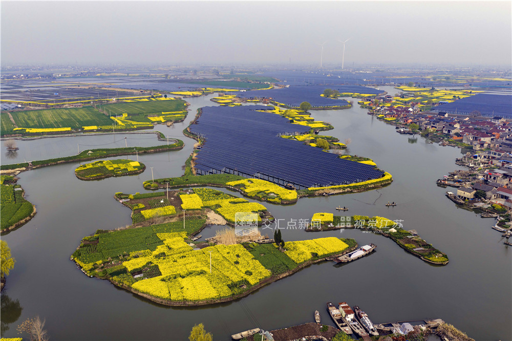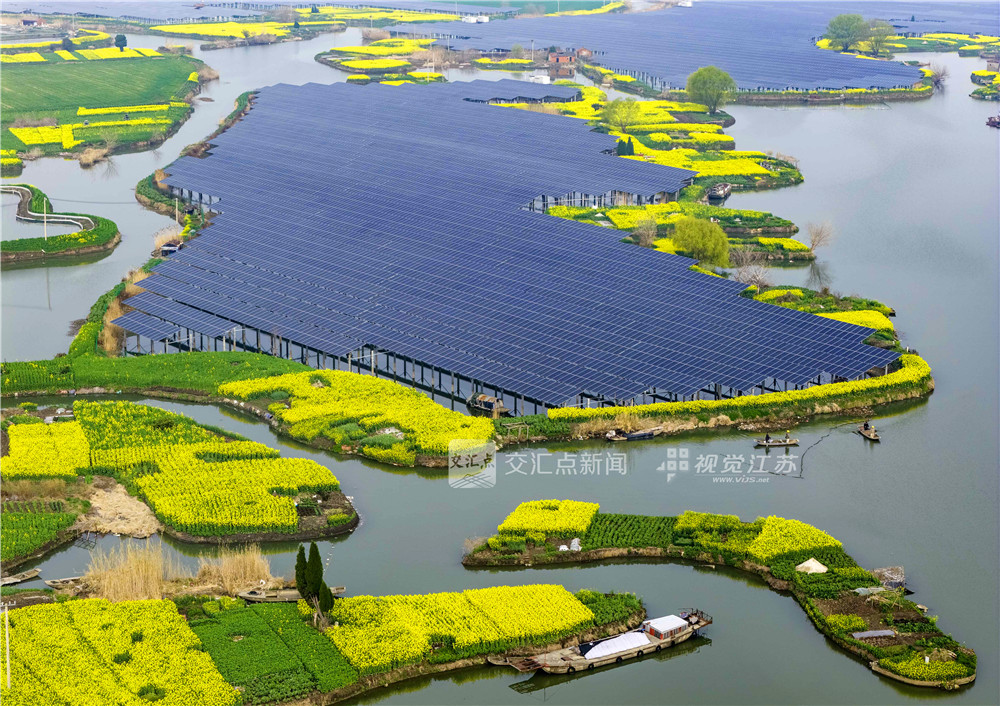 (特约摄影 汤德宏 9:48摄 14:55上线)3月20日,工作人员在泰州市海陵区华港镇下溪村乘船巡检水上光伏设备。春日时节,地处里下河水乡的下溪村,金黄的油菜花田、采油机、连片光伏板与风力发电机相映成趣。